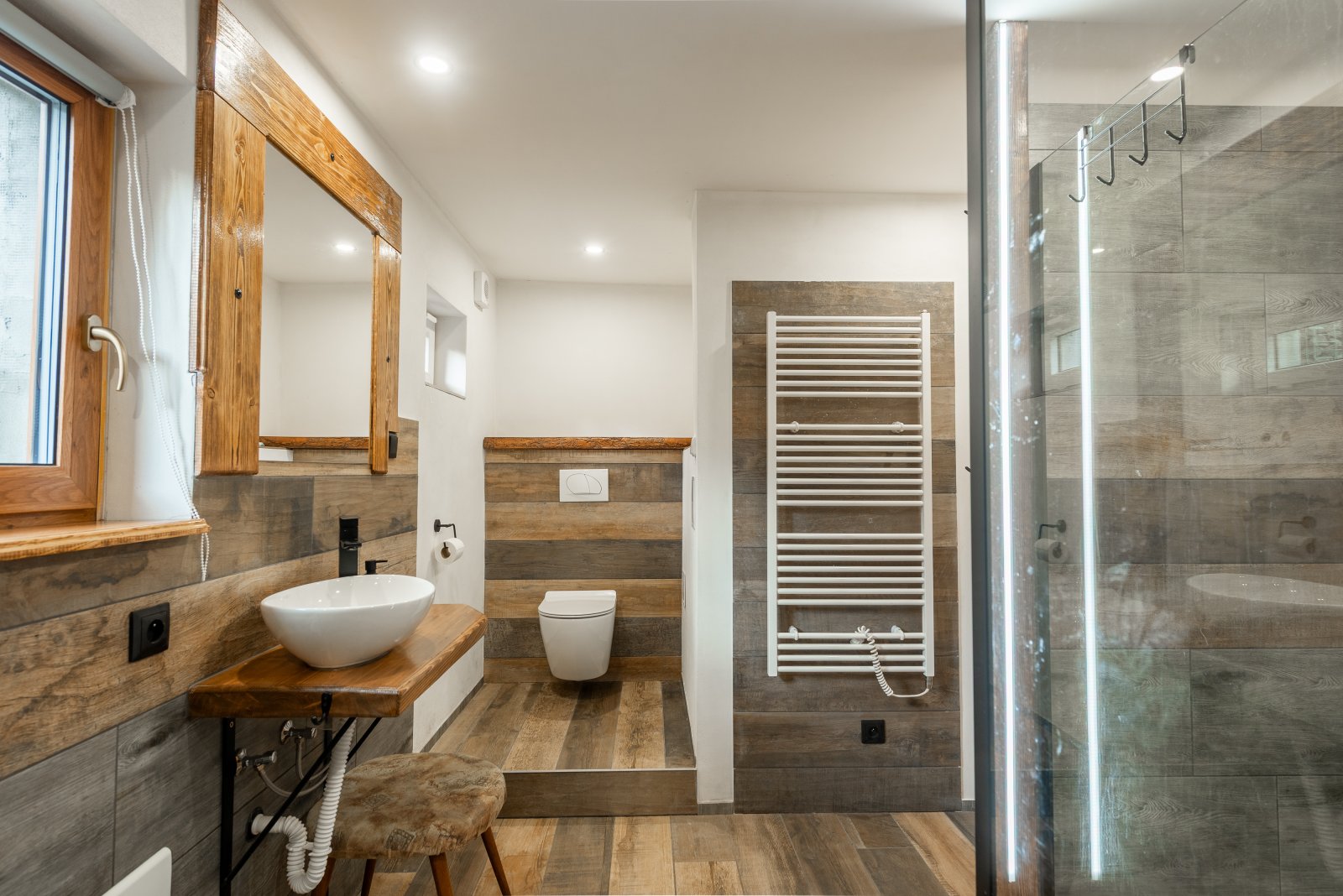 Přízemí - přes vstupní chodbu se dostaneme do kuchyně, ze které je vstup do prostorného obývacího pokoje s krbem či na druhou stranu do koupelny se sprchovým koutem a WC. K dispozici je dále samostatné WC pro komfort i při plném obsazení. Dále se dostáváme do technického zázemí mj. pro údržbu a skladování.