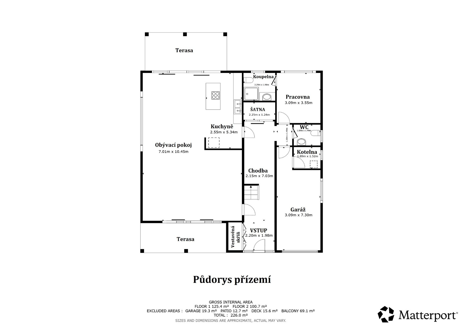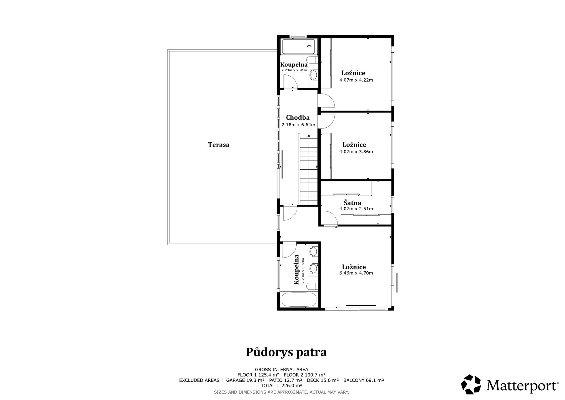 V patře se nachází hlavní ložnice s vlastní koupelnou a šatnou, dvě další ložnice s vestavěnými skříněmi, druhá plně vybavená koupelna a rozlehlá terasa o výměře 70 m² s hliníkovou pergolou – ideální místo pro relaxaci i soukromé chvíle.