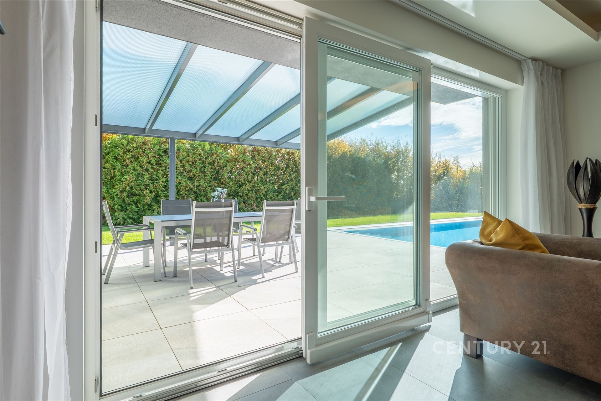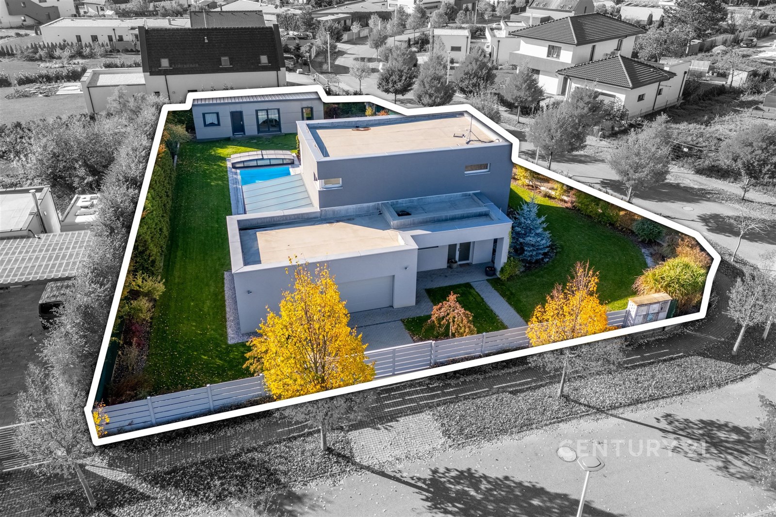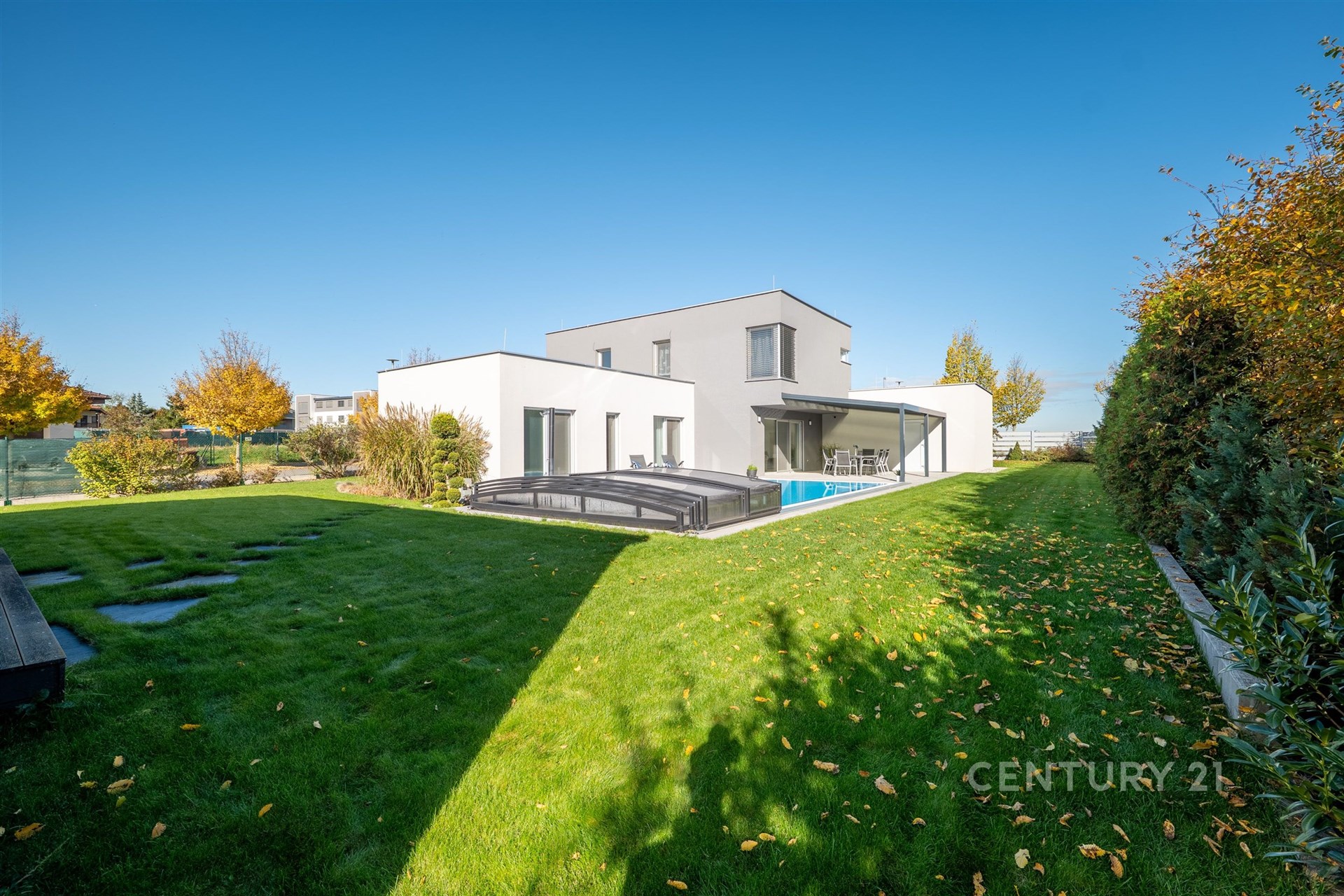 Na zahradě najdete přelivový slaný bazén Albixon (8×4 m) s tepelným čerpadlem, plně automatickou filtrací a možností koupání od dubna do října. Automatická závlaha napojená na retenční nádrž zajišťuje vždy dokonale zelený trávník.