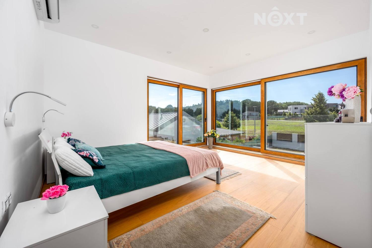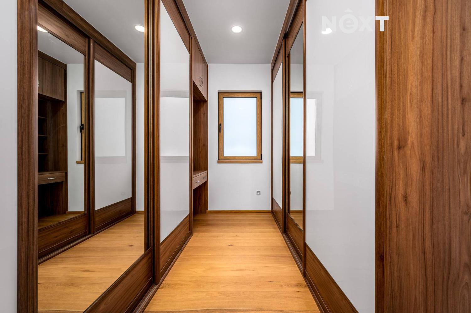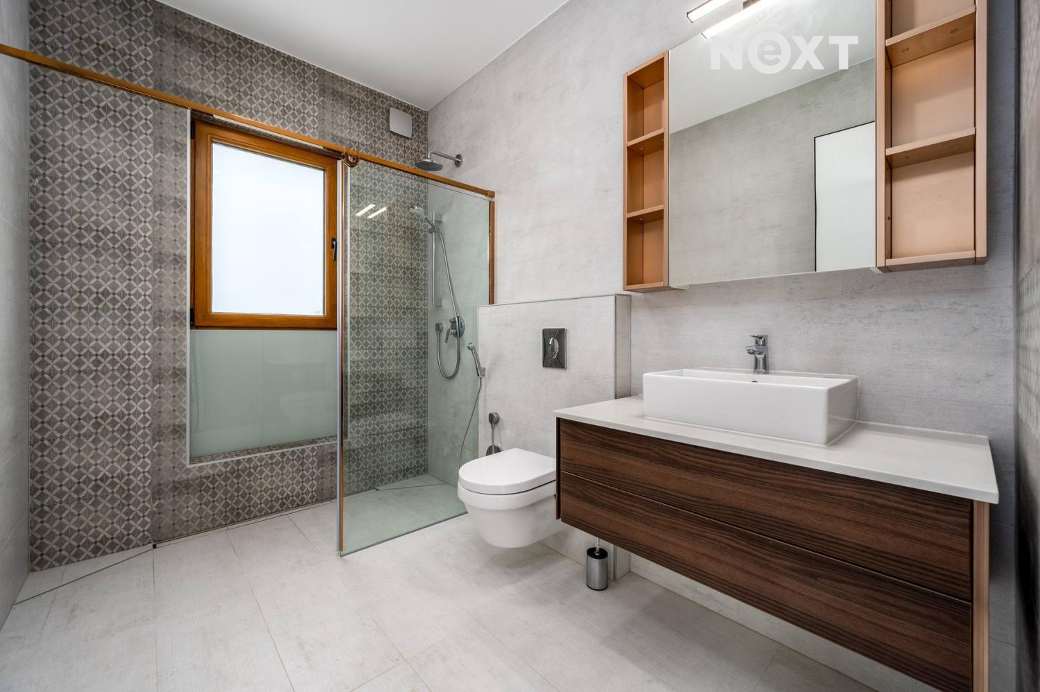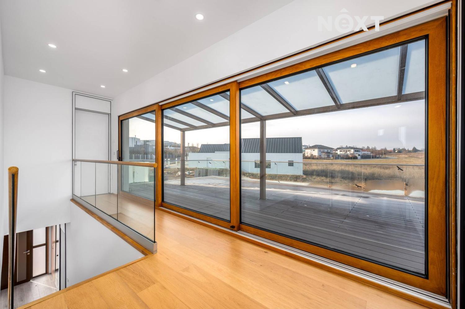 Designové „plovoucí“ schodiště Vás zavede do patra, kde se nachází hlavní ložnice se samostatným vchodem, koupelnou a šatnou. Dále dva další pokoje a plně vybavená koupelna. Velkorysá sluneční terasa o výměře 70 m² s hliníkovou pergolou nabízí ideální prostor pro relaxaci.