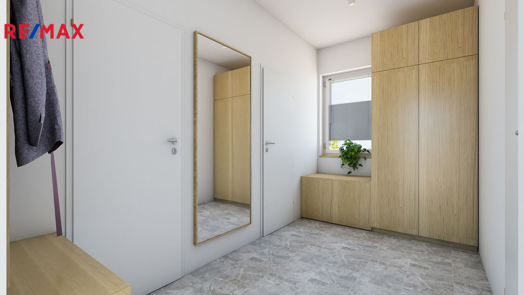 Na podlaze je položena keramická dekorativní dlažba o rozměrech 60x60 cm. Plastová okna jsou jsou z vnitřní strany bílé barvy, vnější antracit a jsou vybavena moderní stínící žaluzií typu plisé.