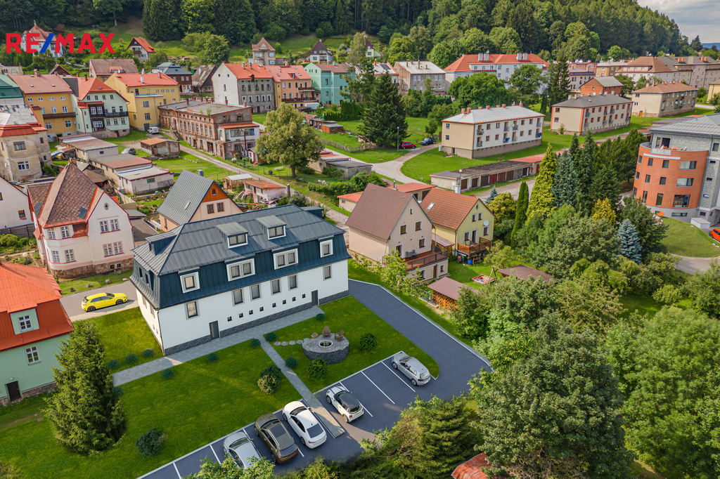 Bytový dům ze začátku 20.století prošel kompletní rekonstrukcí, která byla provedena velmi citlivě s ohledem na zachování charakteru a rázu celého objetu. Pro tento dům je charakteristická mansardová střecha, která je zachována a v podkroví doplněna pultovými vikýři pro denní osvětlení interiéru. Střecha má novou konstrukci střešního pláště s krytinou z hliníkového střešního systému Prefalz rakouské firmy PREFA Aluminiumprodukte. Tento systém se vyznačuje naprostou bezúdržbovostí a dlouhou životností.