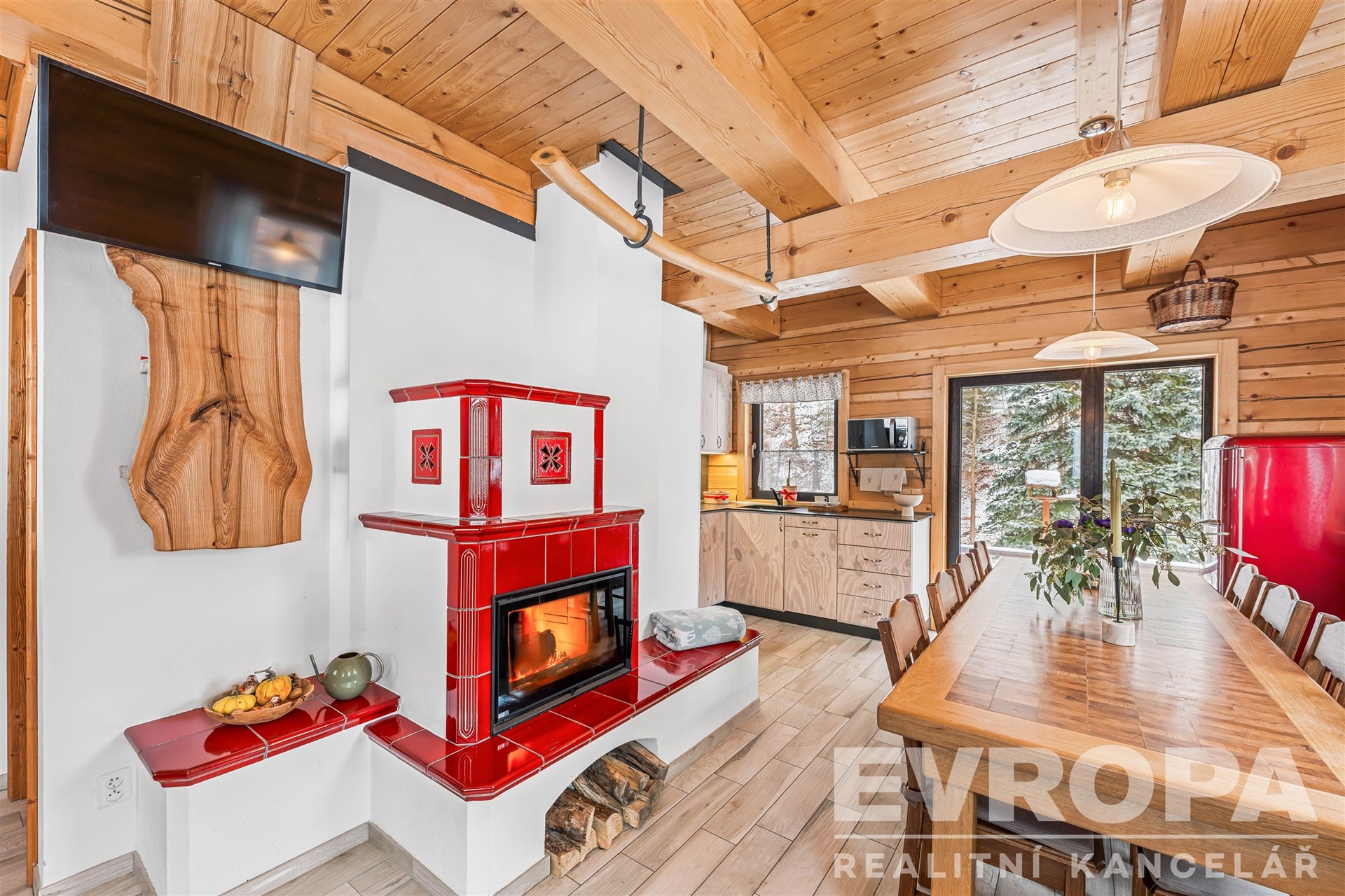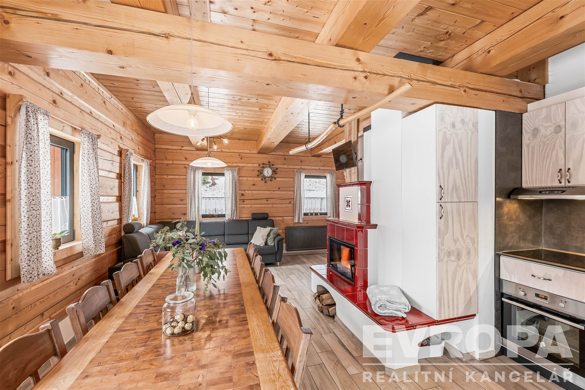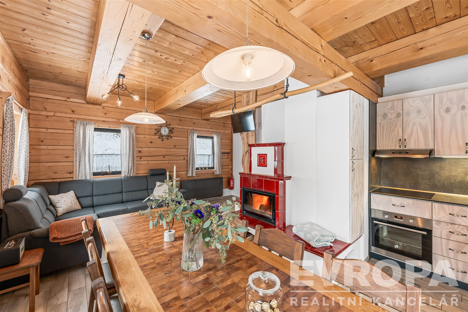 Interiér je dokonalým propojením dřeva, doplněné o stylová kachlová kamna a designovou dlažbu. Koupelny jsou vybavené vkusnou sanitou, podlahovým vytápěním a elektrickými žebříčky.