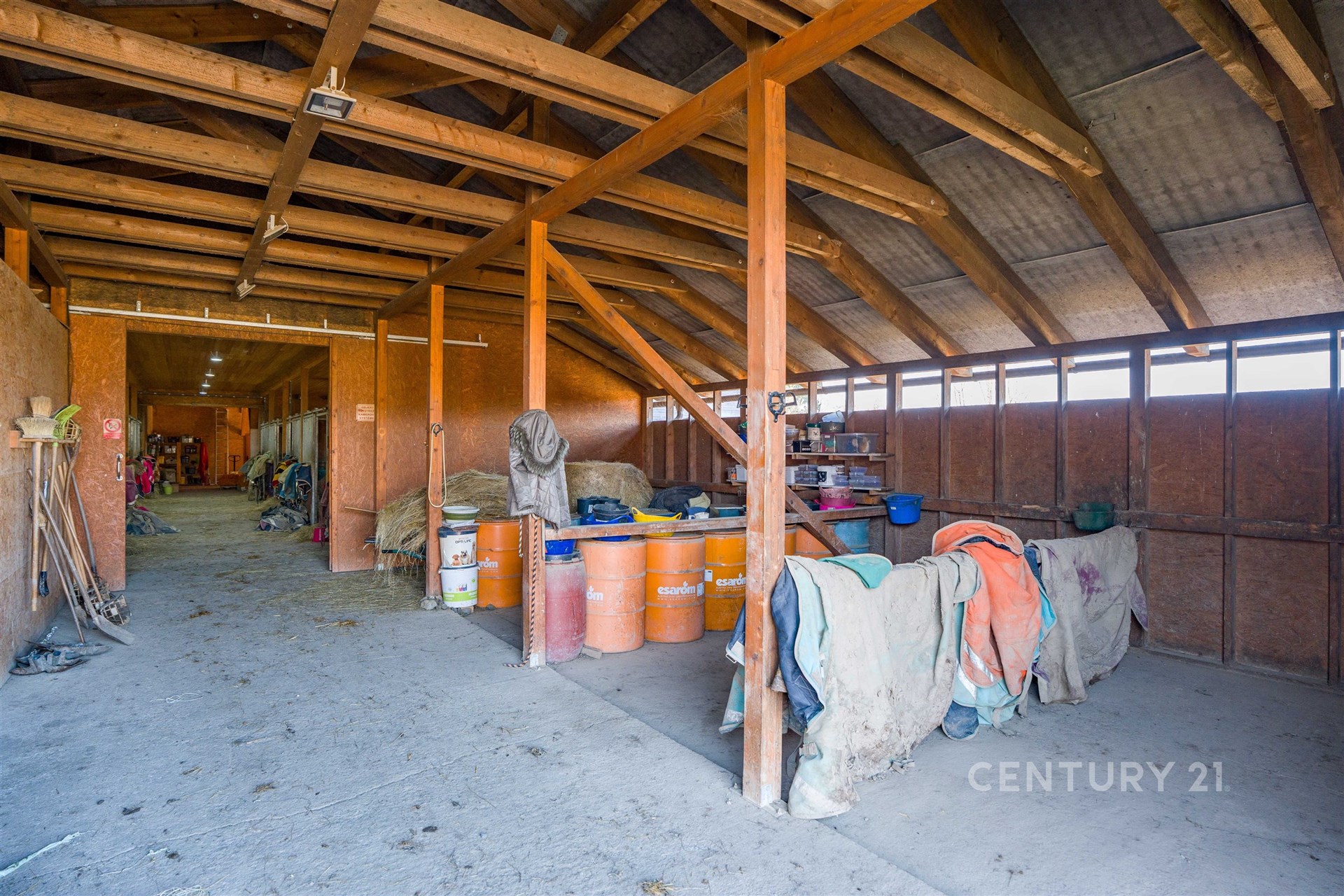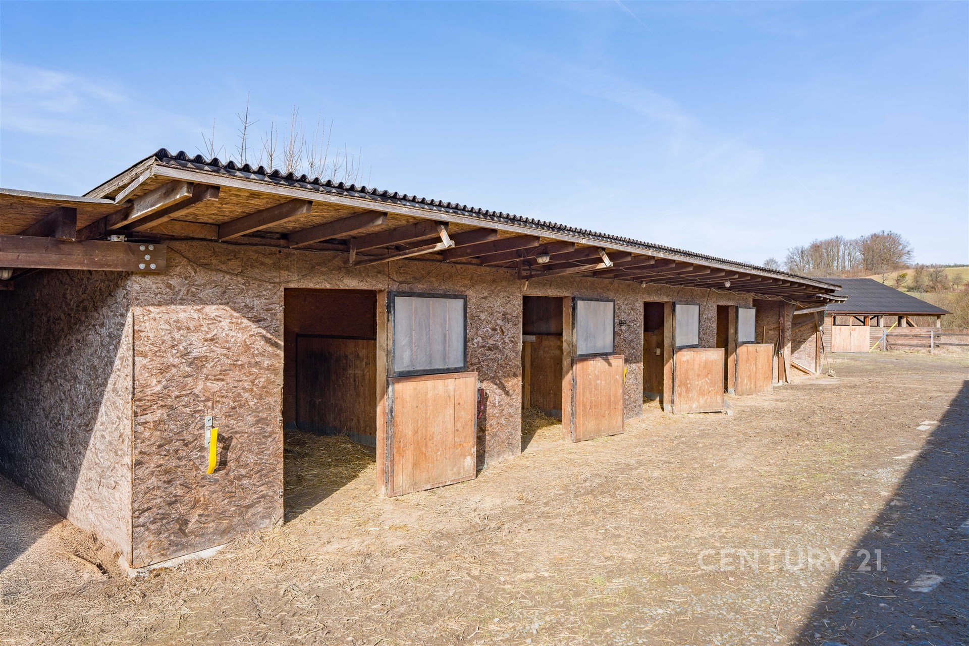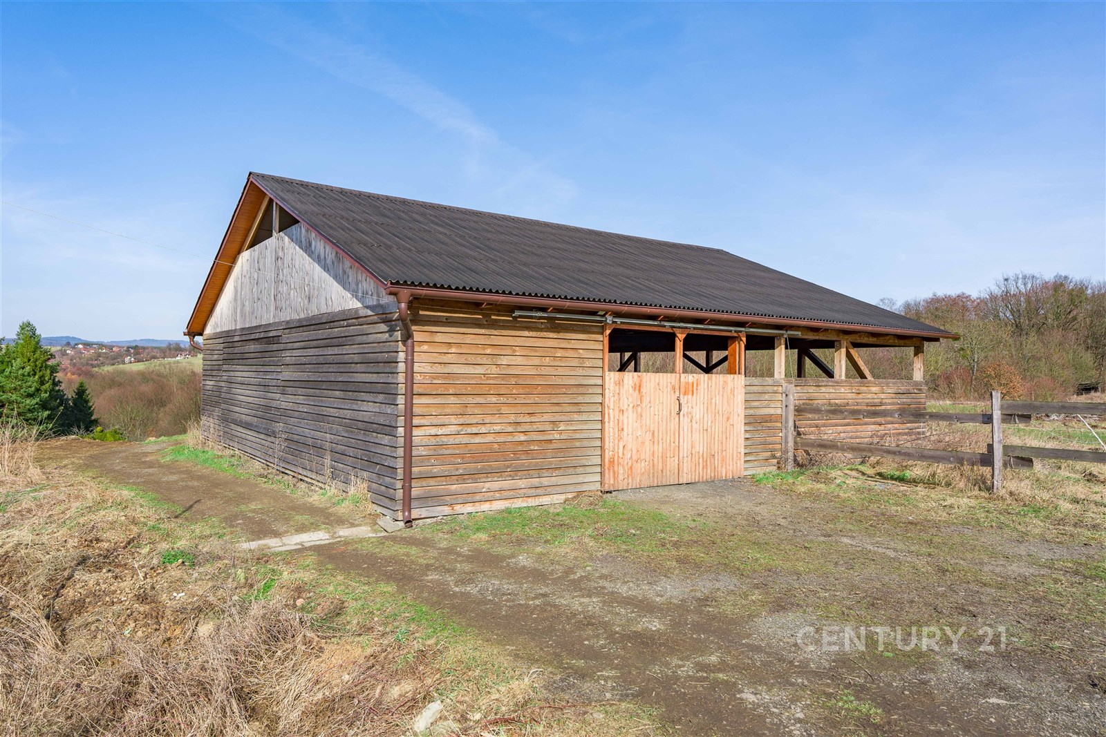 6. Velký přístřešek (20 × 6 m) Dřevěná stavba s volným ustájením a přístupem na 2,5hektarové pastviny. Snadnou úpravou přebudovatelné na 7 vnitřních boxů.