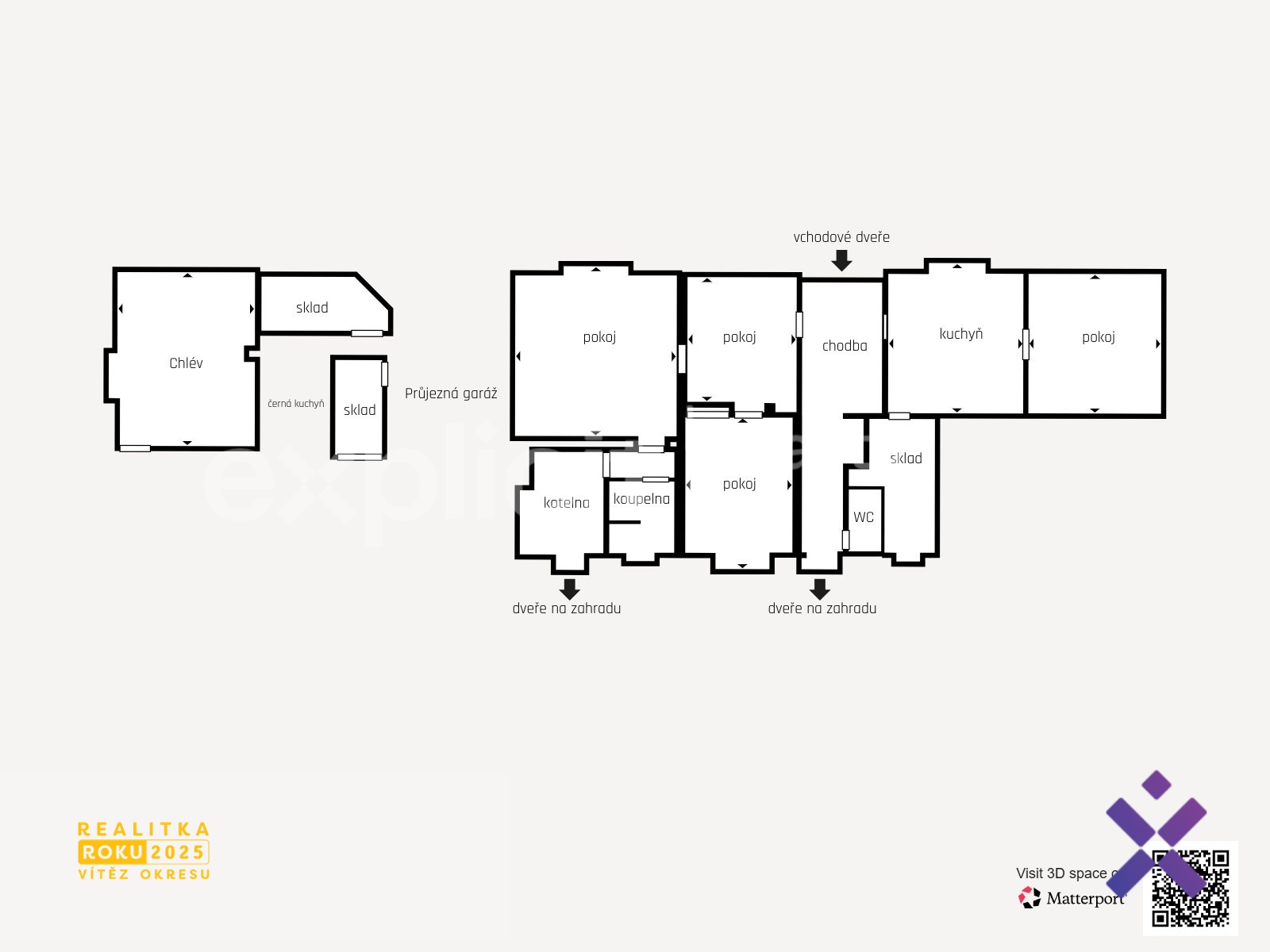 Hlavní část objektu: přízemní budova 127 m² 4+1 s rozsáhlou půdou o výměře 221 m², kterou lze přestavět na další kanceláře či výrobní prostory. Celkem 3 garáže, jedna přímo v domě a dvě samostatně stojící, ideální pro parkování nebo skladování.