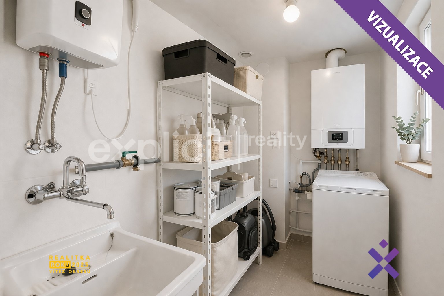Naproti ní je část domu samostatně uspořádaná a slouží jako sanitární a skladovací zóna, je zde samostatná toaleta, koupelna vybavená vanou a bojlerem a vedle ní menší místnost vhodná například jako špajz nebo sklad.
