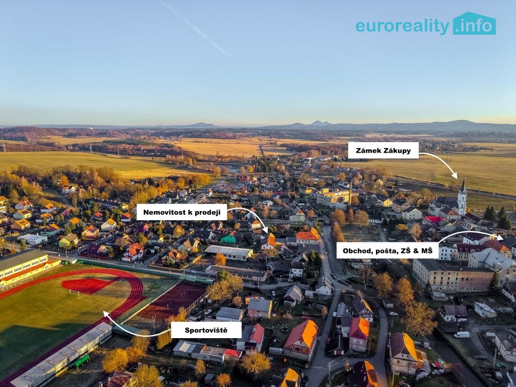 Město Zákupy nabízí základní občanskou vybavenost – nachází se zde škola, školka, obchody i zdravotní středisko. Dominantou města je známý Státní zámek Zákupy. Výborná je také dopravní dostupnost – do Česká Lípa je to přibližně 10 minut jízdy, do Liberec přibližně 40 minut.