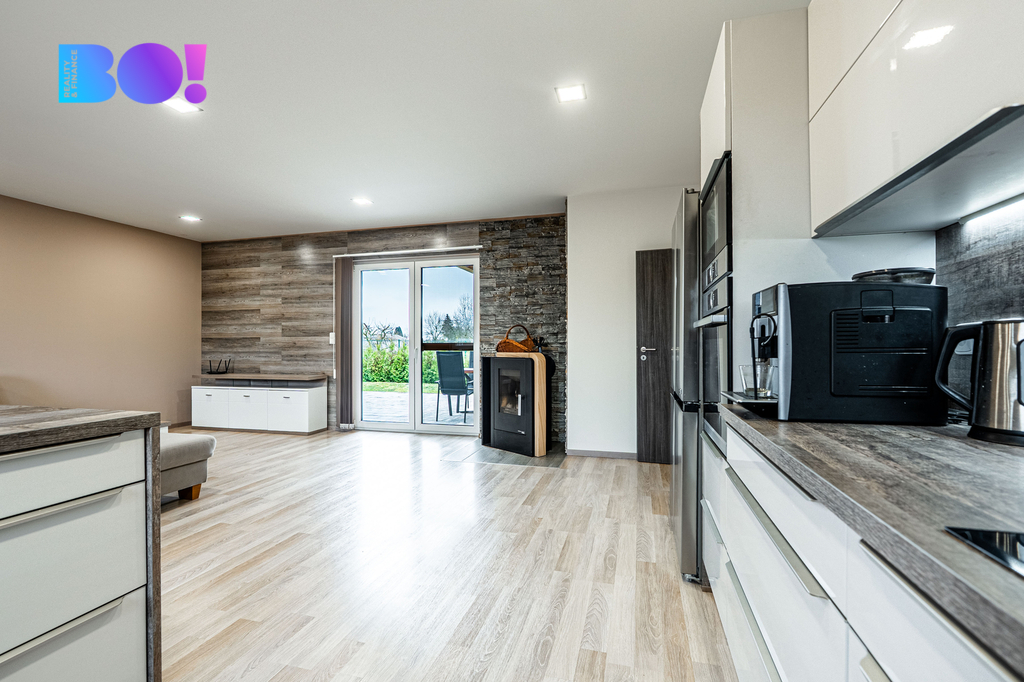 Dominantou domu je světlý obývací prostor s kuchyňským koutem, který plynule navazuje na zahradu. Atmosféru domova podtrhují krbová kamna, která dodají interiéru nejen teplo, ale i jedinečný pocit pohody. Komfort po celý rok zajišťuje také podlahové vytápění napojené na elektrokotel.