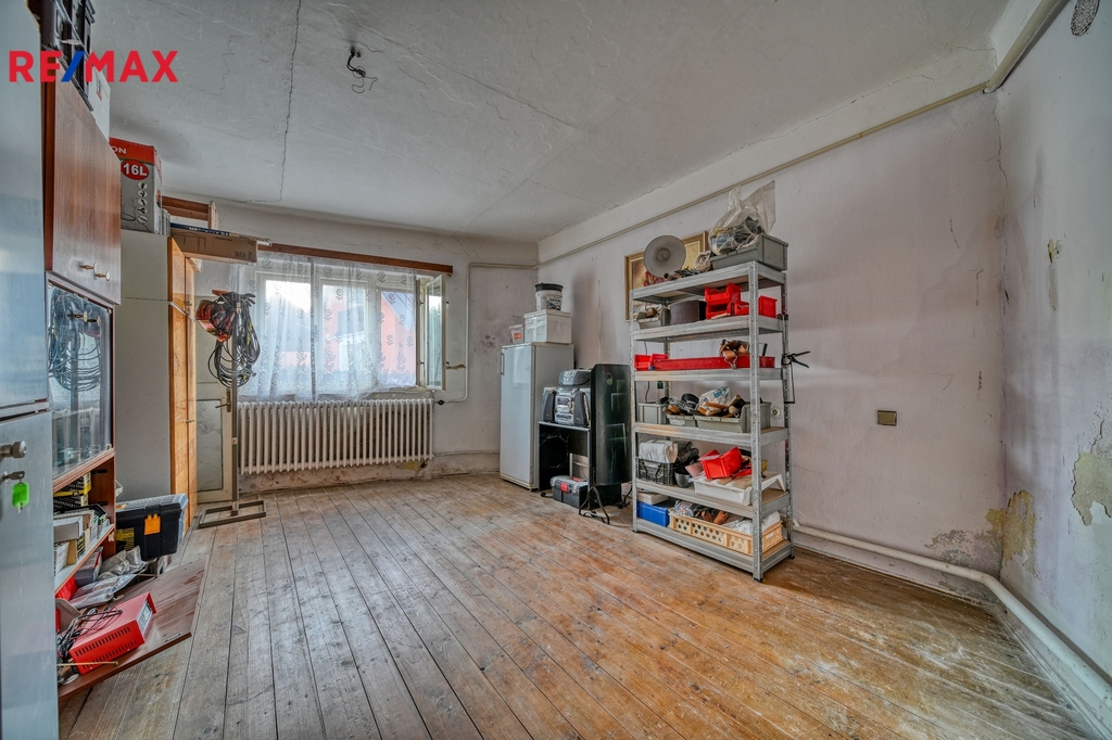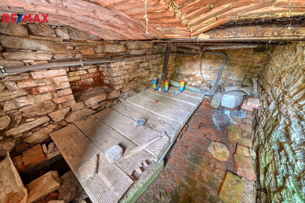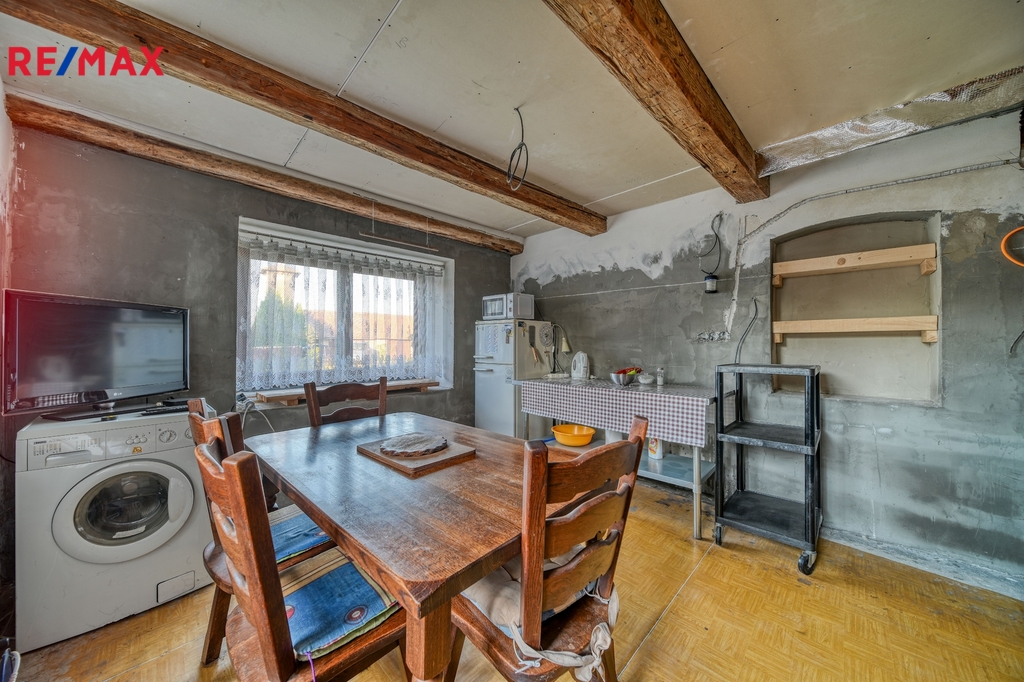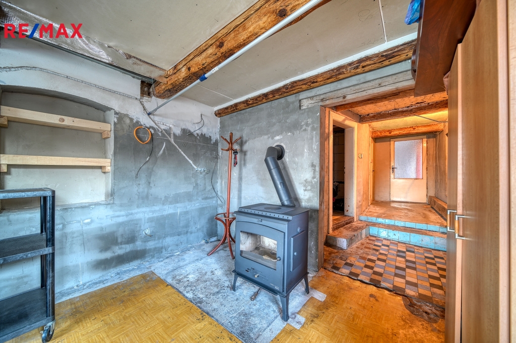 Dům je dispozičně řešen jako 3+kk. V hlavní místnosti proběhla rekonstrukce, jsou zde udělané nové stropy s přiznanými trámy, kvalitní plastová okna – trojskla v barvě a krbová kamna s výkonem 12 kW. Místnost je připravena na osazení kuchyňskou linkou. Chodbou projdeme do ložnice a dalšího pokoje. Zadní pokoj má hezkou dřevěnou podlahu.