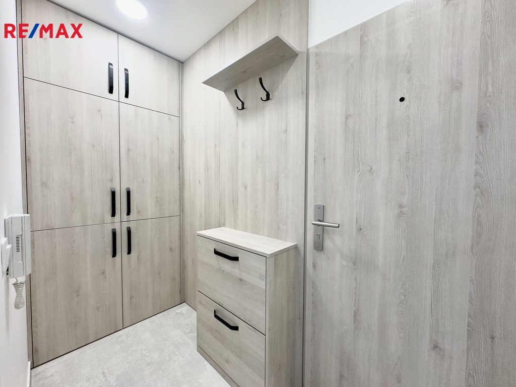 - V chodbě šatní skříň s vestavěnou pračkou, botník a věšák.