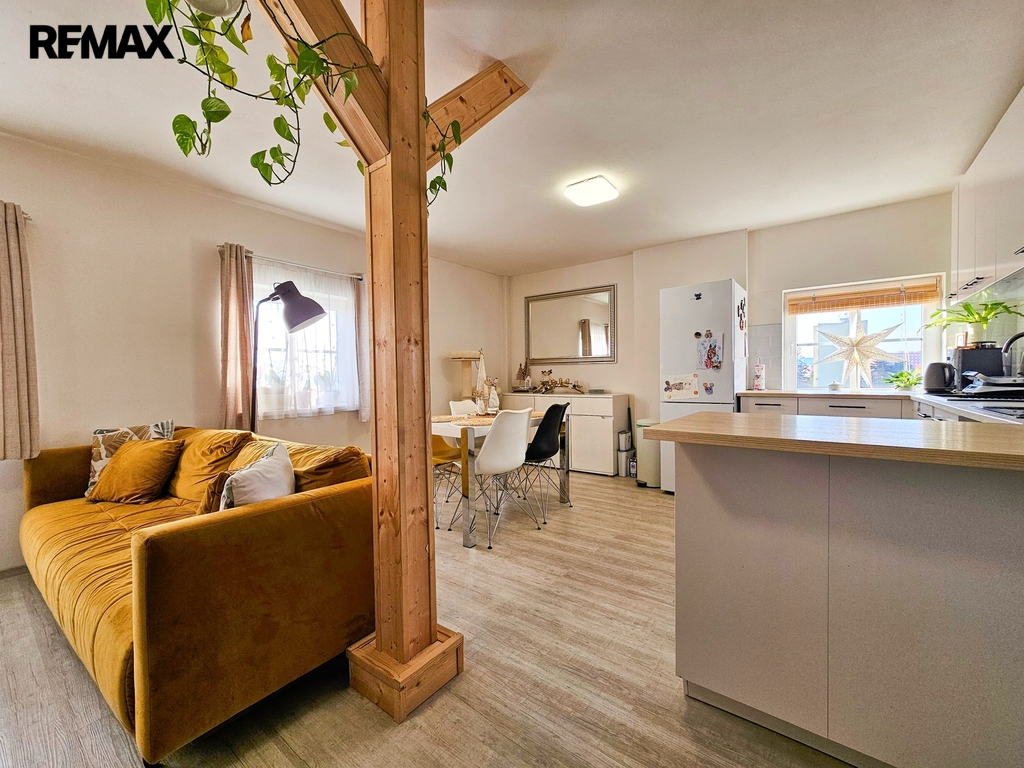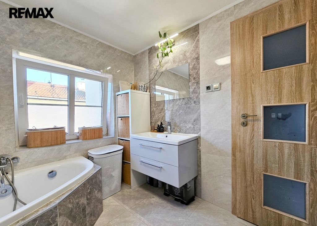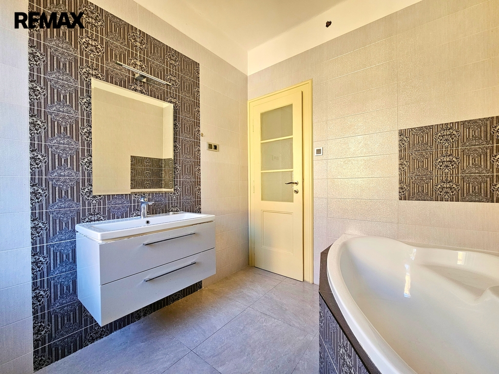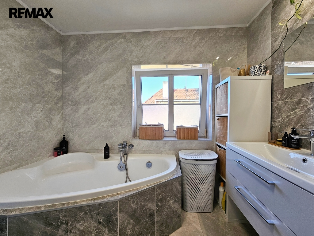 • 1. NP – byt o dispozici 3+kk, podlahová plocha cca 80 m². Byt je po kompletní rekonstrukci, zachovává původní obložky, disponuje novými podlahami, koupelnou i kuchyňskou linkou. Aktuálně je dlouhodobě pronajat, nájemníci mají zájem v nájmu pokračovat.