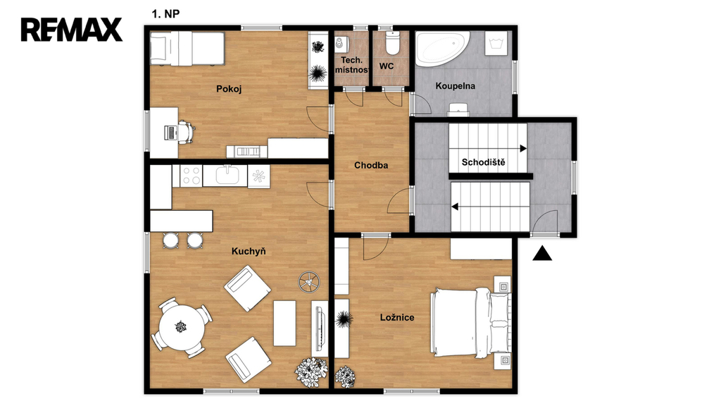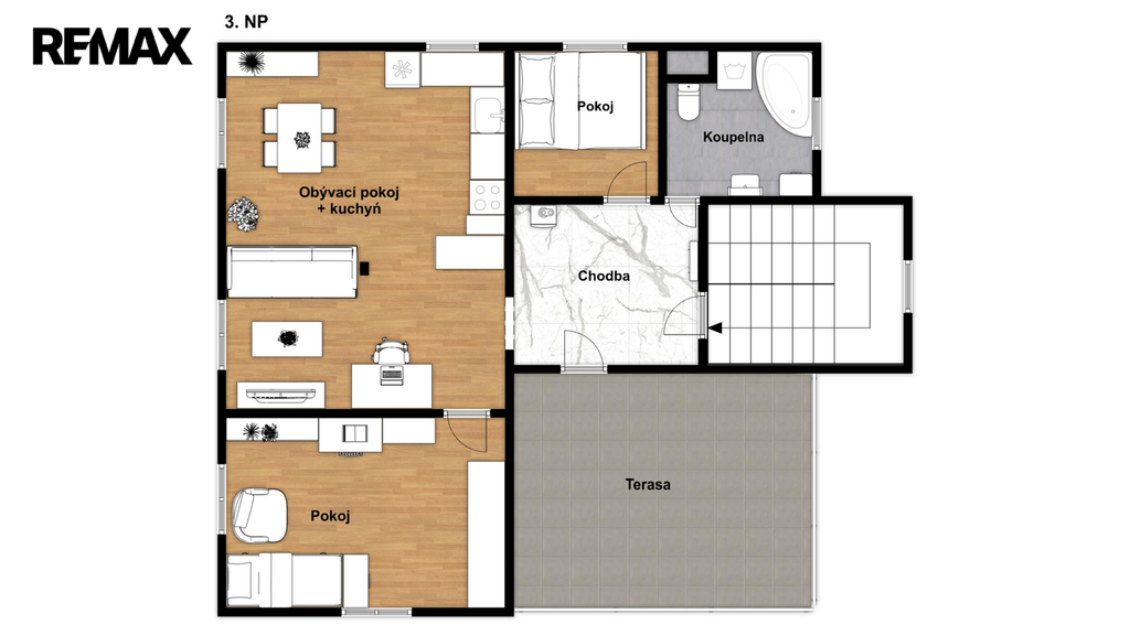 • 3. NP – byt 3+kk s terasou, podlahová plocha cca 60 m², po kompletní rekonstrukci, obsazen do 5–6/2026.