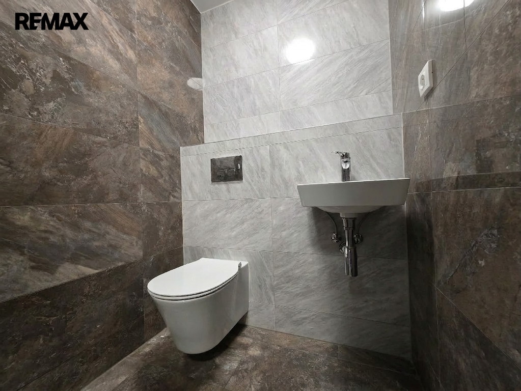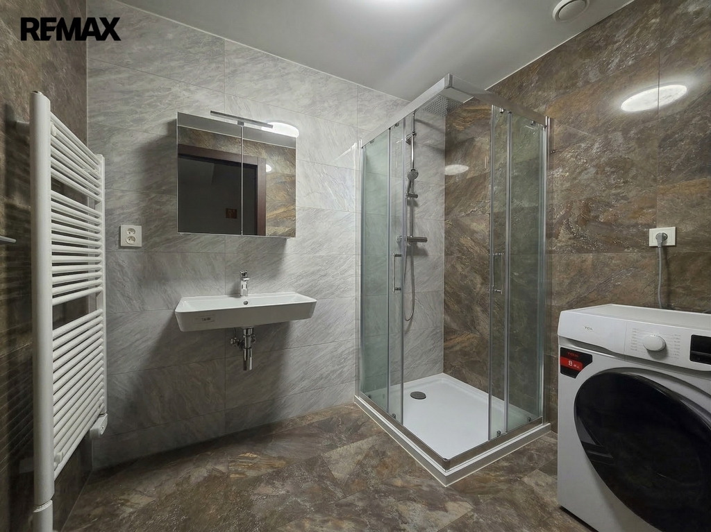 Koupelna a toaleta jsou provedeny v nadčasovém designu a obloženy elegantní velkoformátovou dlažbou a obklady s texturou kamene. Koupelna disponuje proskleným sprchovým koutem, moderním umyvadlem, topným žebříkem a je zde pamatováno i na prostor pro pračku/sušičku. Toaleta s umyvadlem je prakticky umístěna v samostatné místnosti.