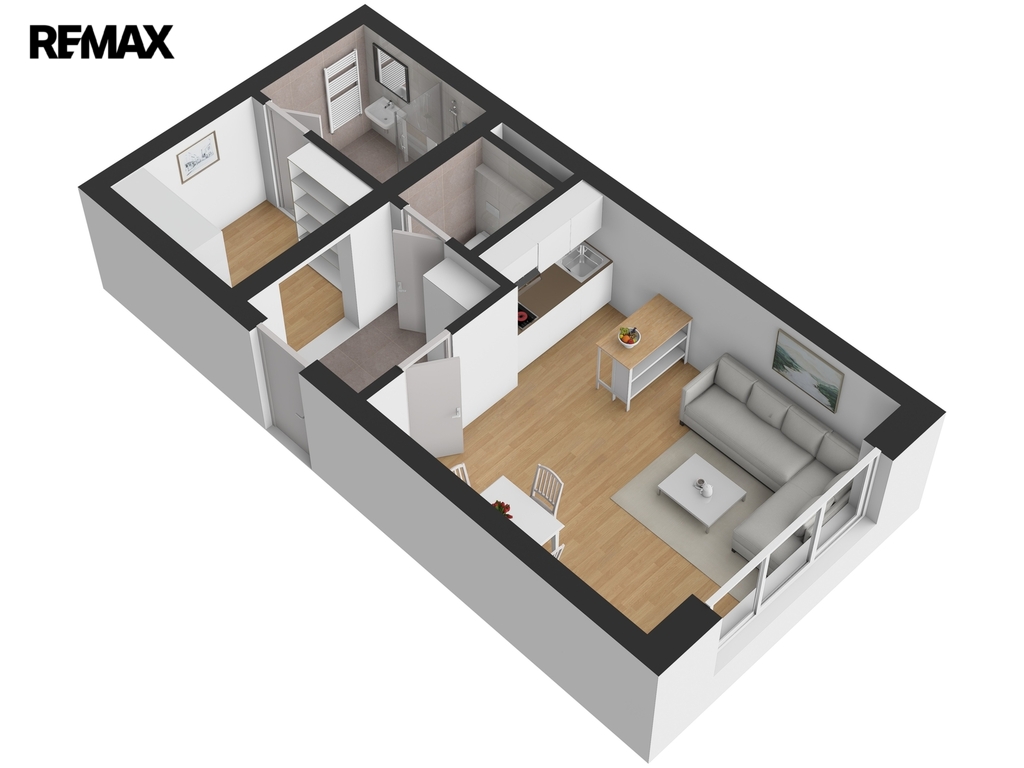Hlavní obytná část spojuje obývací pokoj s kuchyňským koutem. Moderní bílá kuchyňská linka s dřevěným dekorem pracovní desky a obkladu je vyrobena na míru a esteticky zapadá do celkového světlého designu bytu. Obývací pokoj nabízí dostatek prostoru pro relaxaci/odpočinek i jídelní část. Na podlahách v obytné části je položena kvalitní plovoucí podlaha, v předsíni, šatně a koupelně pak praktická dlažba.