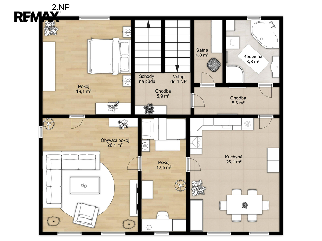 Druhé podlaží - 3+1 - celková podlahová plocha 102 m² po rekonstrukci