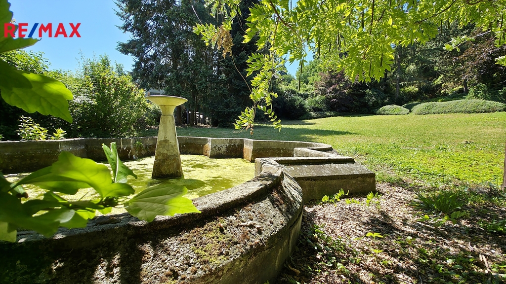 Zahrada plná zeleně, klidu a noblesy je rozdělena do tří vzájemně propojených částí. V přední části Vás uvítá dekorativní vstupní prostor s květinovou výsadbou a vstupem do historických dveří vily. Pokračuje kolem domu a směrem dozadu plynule přechází v terasovitý svažitý prostor, který pozemku dodává členitost a šarm. Zde se nachází romantická studánka, nenápadně zakomponovaná mezi zelení.