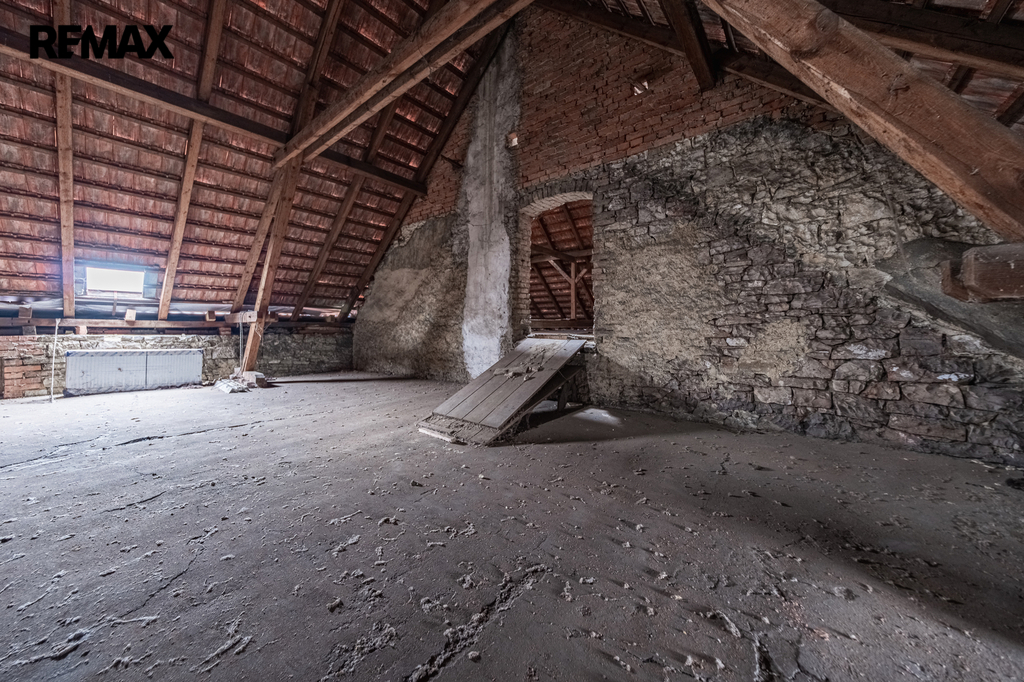 Podkroví domu je v současnosti určeno k rekonstrukci a nabízí velký potenciál pro vybudování nájemních bytů či ubytovacích kapacit.
