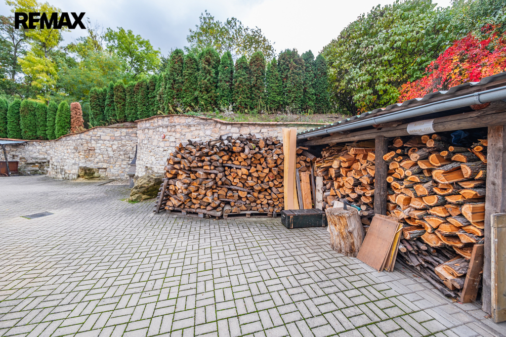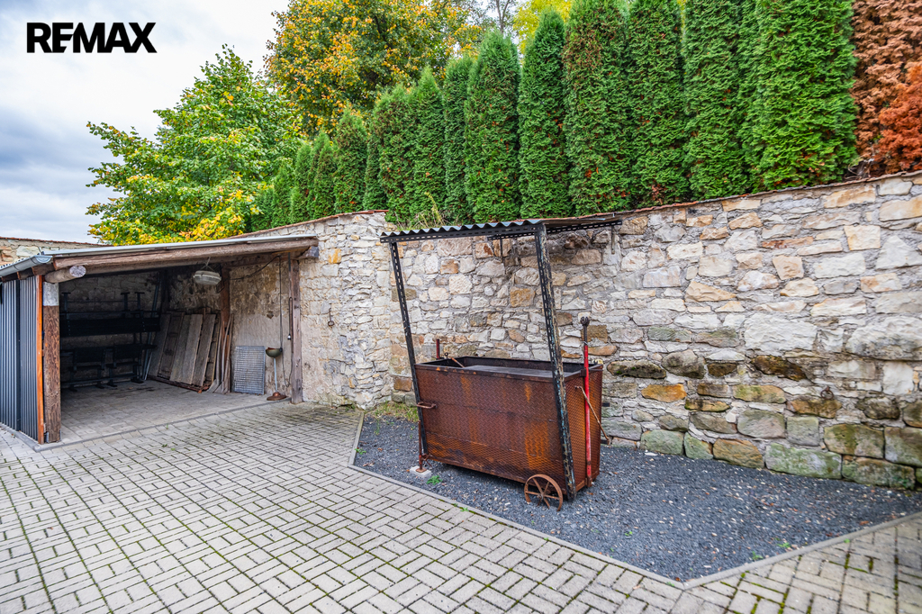 V uzavřené části pozemku je venkovní přístřešek pro auto, možnost posezení u krbu a předzahrádka s posezením před domem, která doplňuje příjemnou atmosféru objektu.