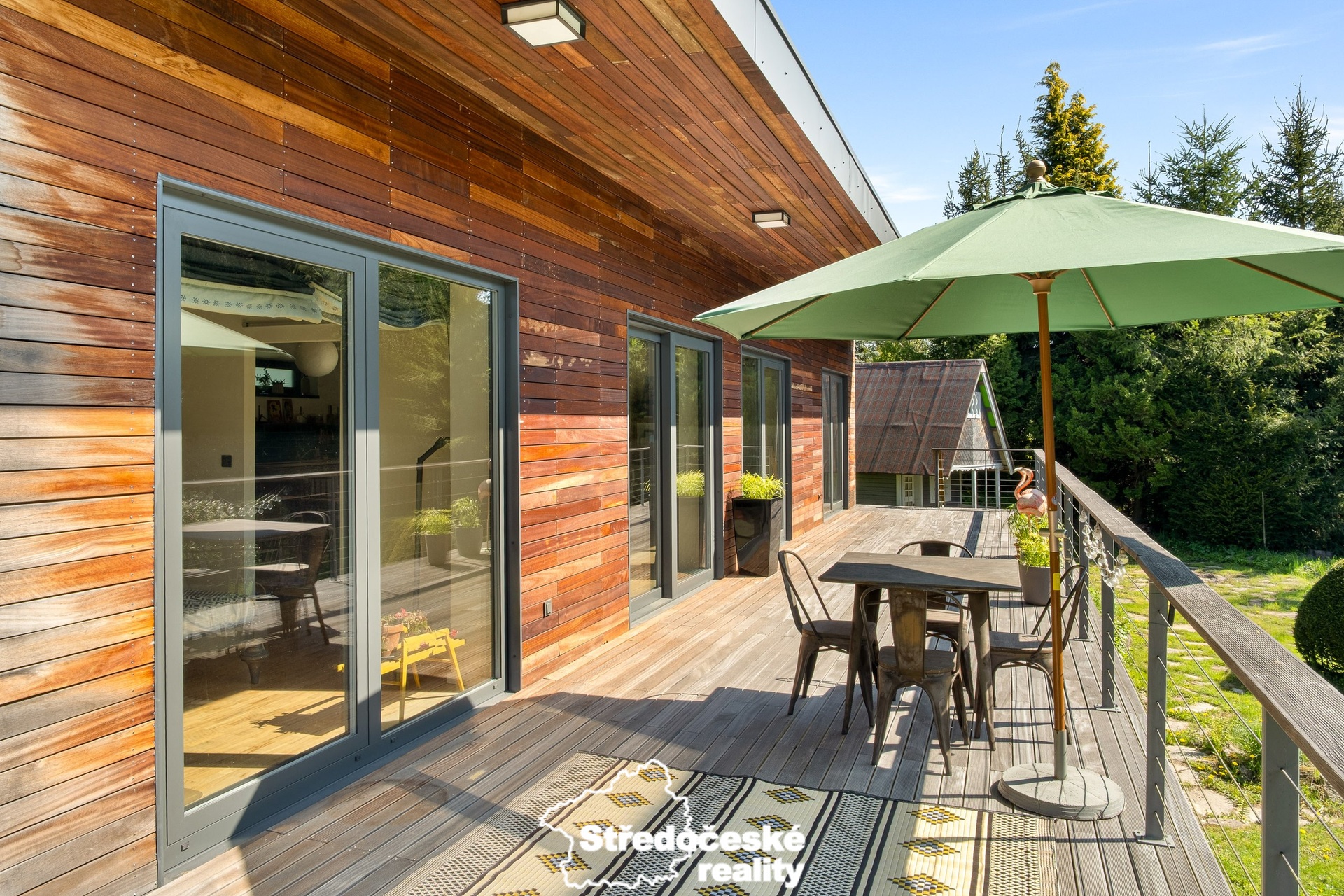 - vstup přes prostornou terasu s posezením a výhledem do zahrady