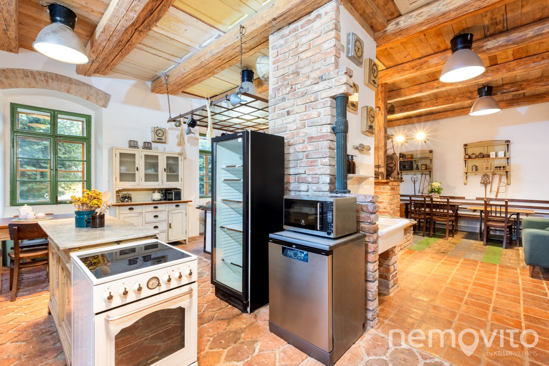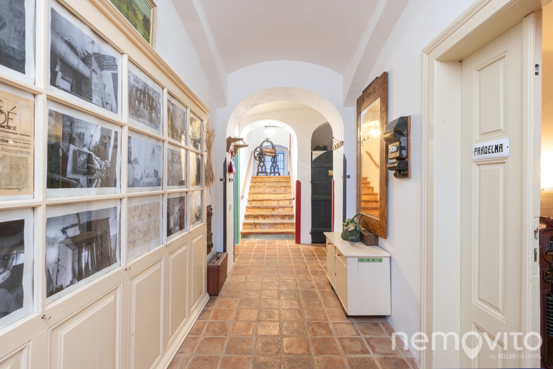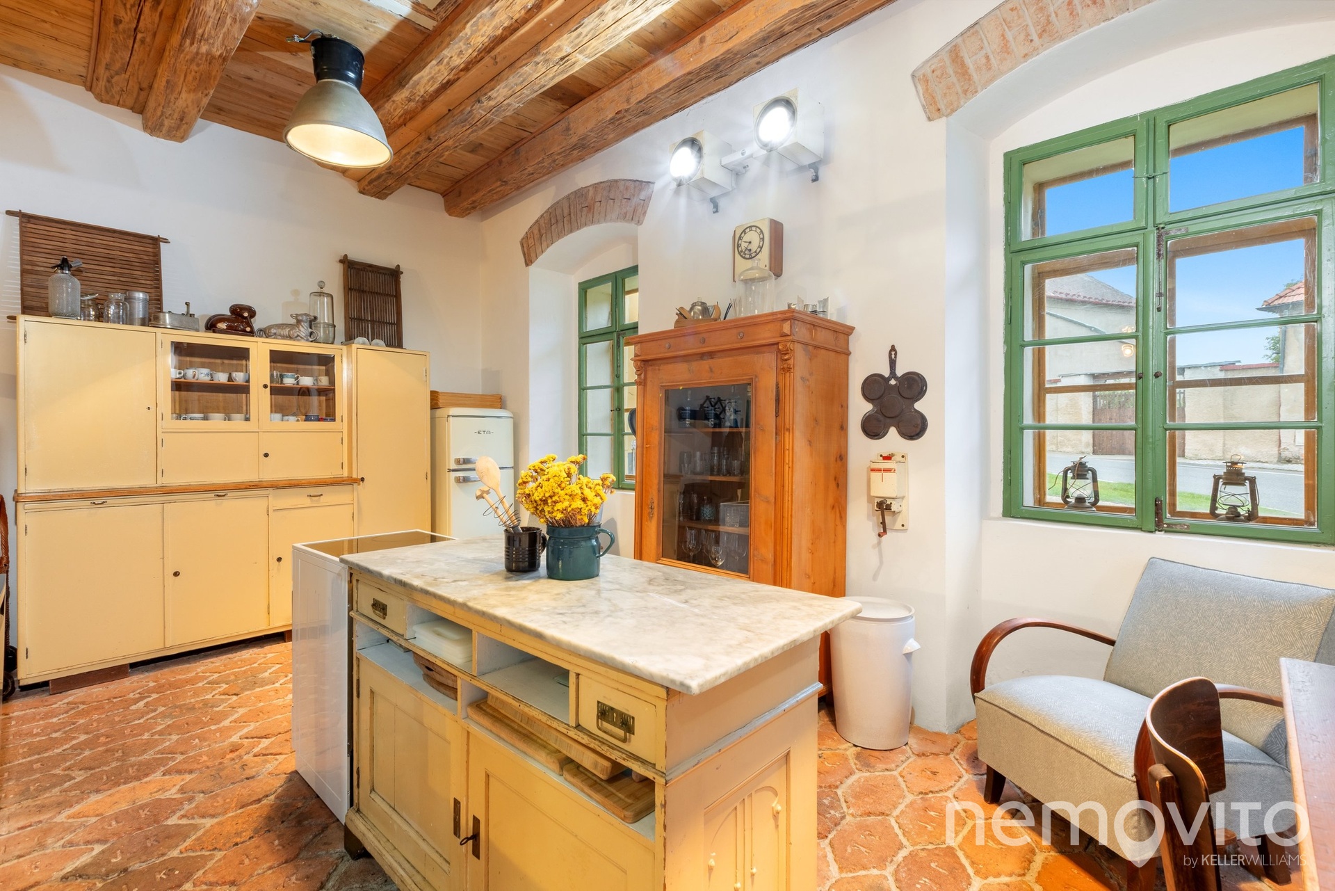 Hlavní část prvního podlaží tvoří velká společenská místnost s vysokým stropem. Její plocha je 65 m2 a kapacitně je s penzionem řešena tak, aby pohodlně pojmula 25 hostů. V hlavní místnosti je jídelní, kuchyňská a společenská část. Dřevo, cihly, kamna, původní okna a dveře - vše tak jak má být, pokud vy nebo vaši hosté hledají prostor, kde by se poctivá atmosféra starých časů dala i krájet. Nebo popíjet, což ostatně umožňuje malý vinný sklípek pod domem.