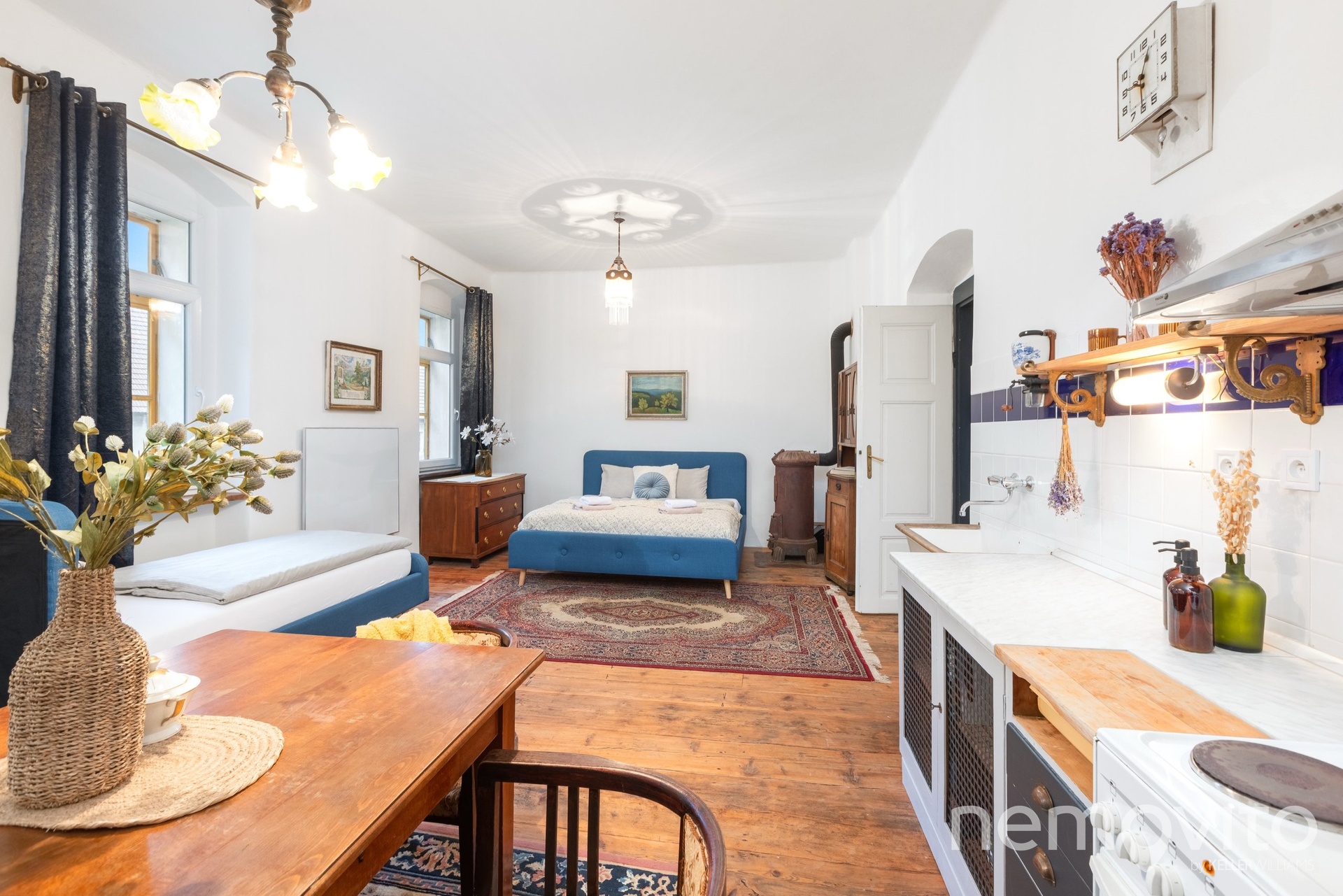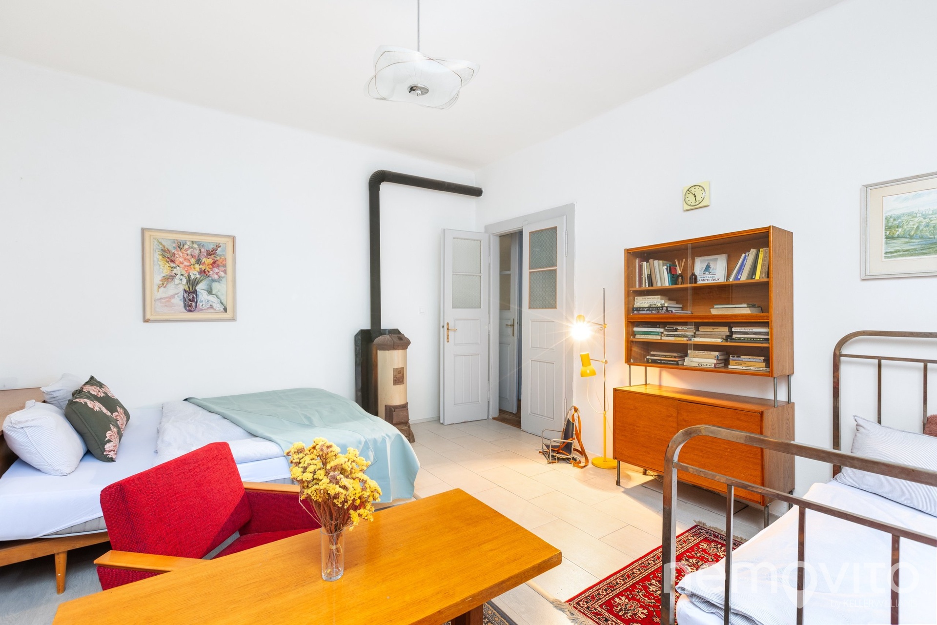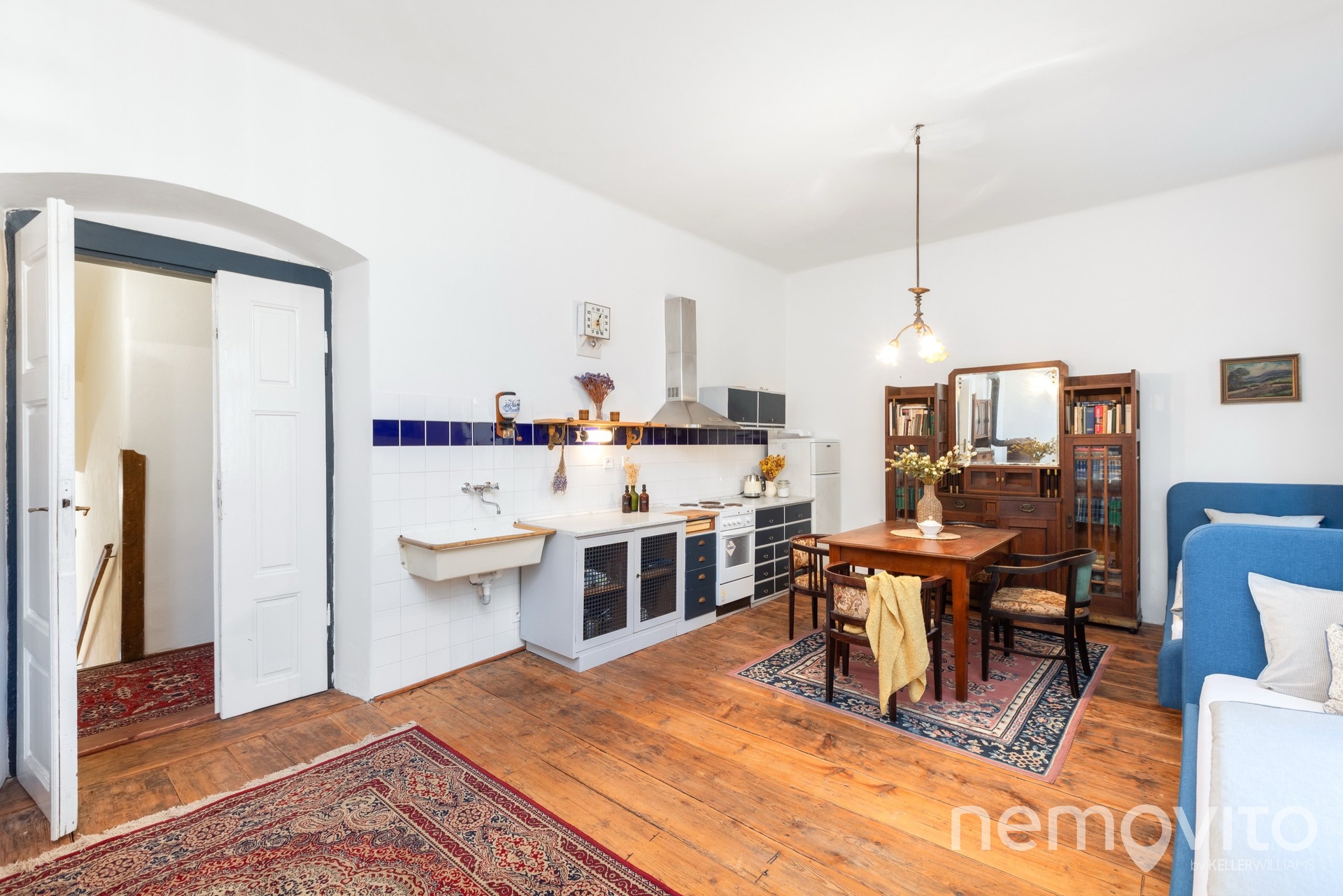 Hlavní část prvního podlaží tvoří velká společenská místnost s vysokým stropem. Její plocha je 65 m2 a kapacitně je s penzionem řešena tak, aby pohodlně pojmula 25 hostů. V hlavní místnosti je jídelní, kuchyňská a společenská část. Dřevo, cihly, kamna, původní okna a dveře - vše tak jak má být, pokud vy nebo vaši hosté hledají prostor, kde by se poctivá atmosféra starých časů dala i krájet. Nebo popíjet, což ostatně umožňuje malý vinný sklípek pod domem.