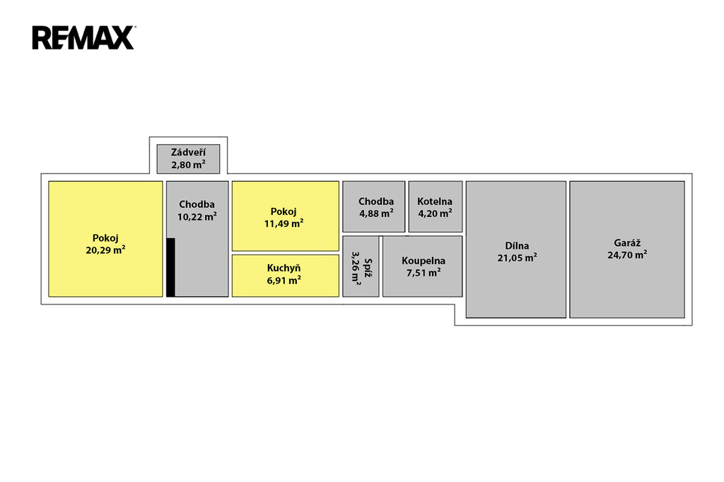 Dispozice zahrnuje obývací pokoj 20,29 m², kuchyň 6,91 m² a spíž 3,26 m² pro uskladnění potravin, dva pokoje 11,49 m² a 10,22 m², koupelnu s WC 7.51 m² a kotelnu 4,20 m². Součástí domu je prostorná garáž 24,05 m² pro pohodlné parkování automobilu a praktická dílna 21,05 m² pro kutily nebo uskladnění nářadí.