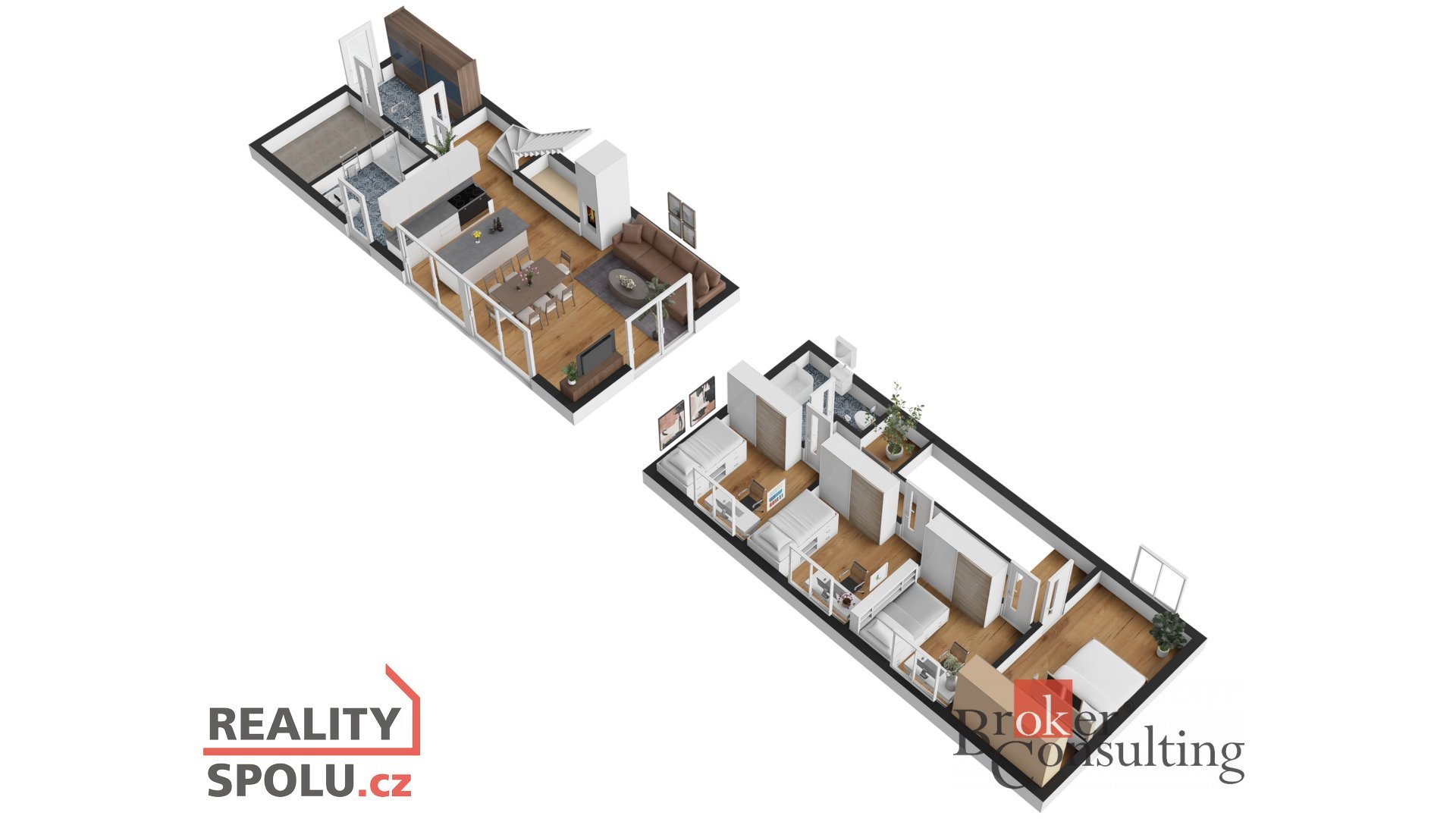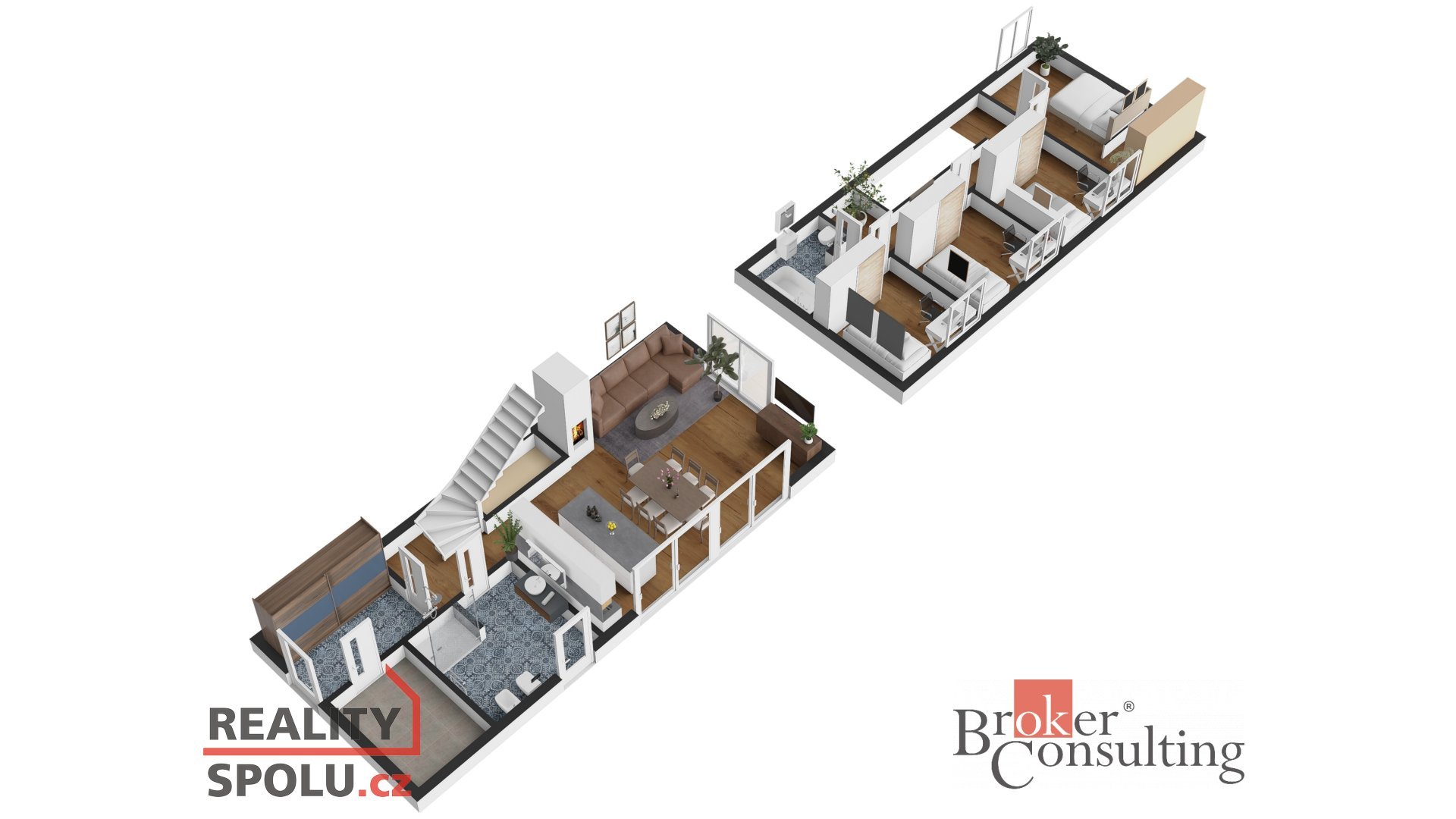 Dominantou přízemí je otevřený obytný prostor s obývacím pokojem, jídelnou a kuchyní, který je přímým vstupem propojen s terasou a zahradou. Dále se zde nachází předsíň, technická místnost a koupelna se sprchovým koutem a toaletou. V horním patře je situována hlavní ložnice se šatnou, tři další samostatné pokoje a druhá koupelna s vanou a WC.