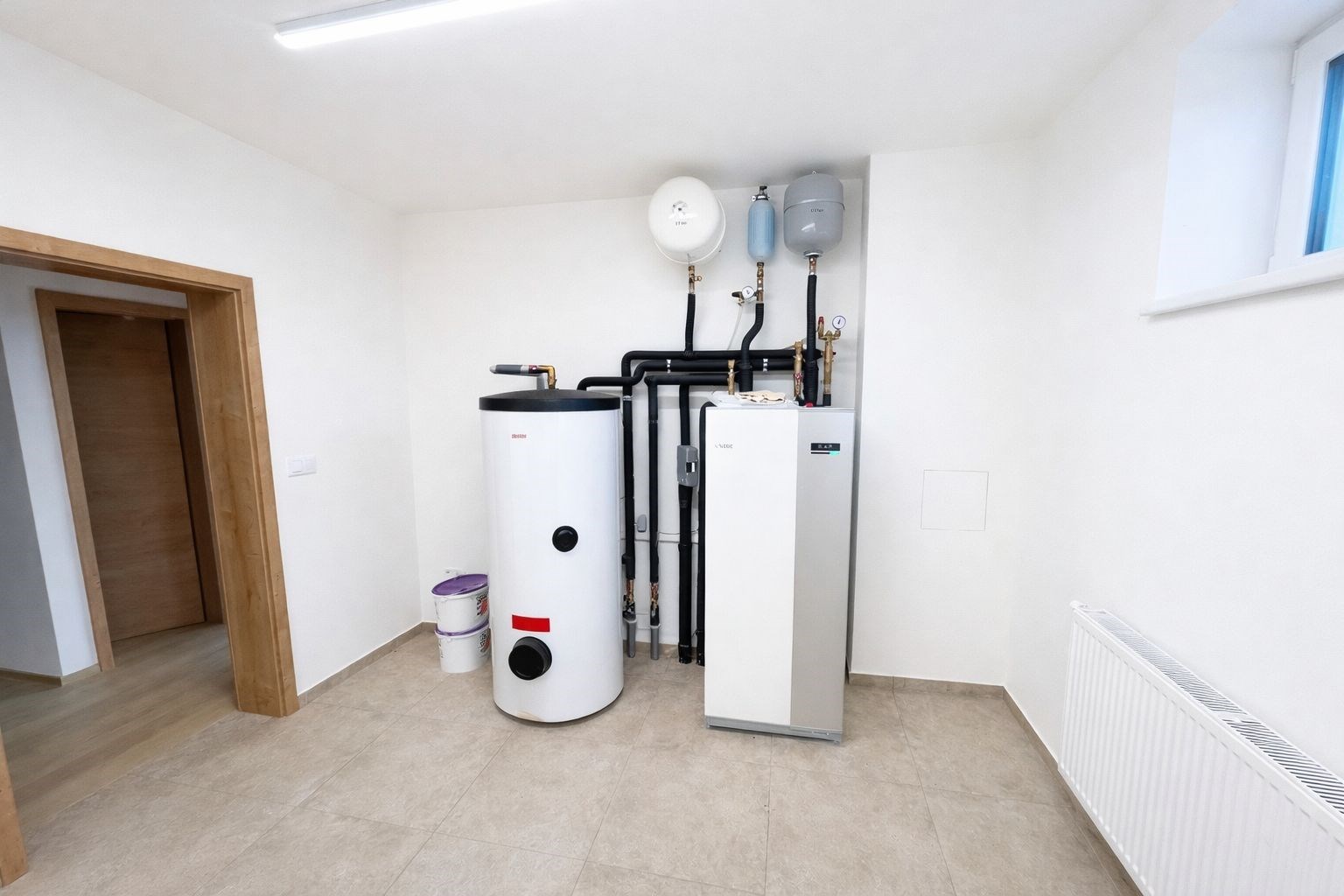 Tepelné čerpadlo je systém zeměvoda od švédského NIBE F1145 6kw + zásobník na TUV OKC 300 NTR/HP, teplá voda – cirkulace, lze napojit na systém smart home Home Assistant a podob. 300metrový kolektor u každého domu. V celém domě je podlahové topení, vyjma garáže, zde je radiátor.