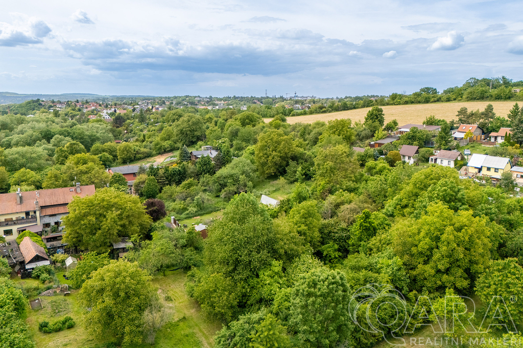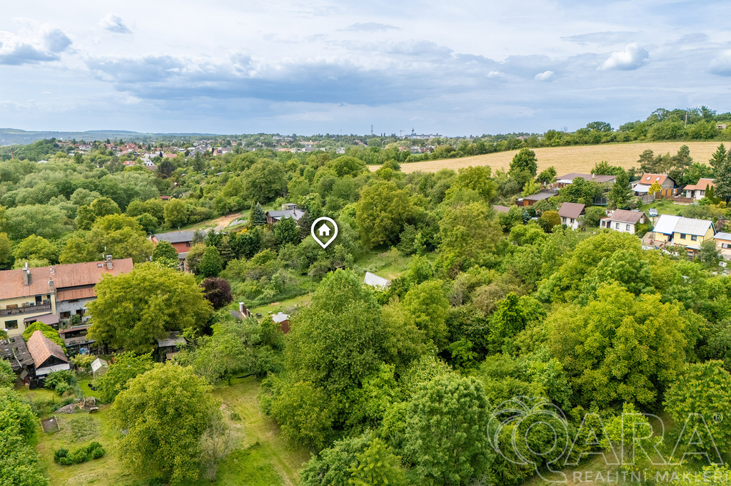 Rozsáhlý pozemek s příjezdovou komunikací, mírně svažitý, ve slepém rameni v klidné části obce Zdiby.