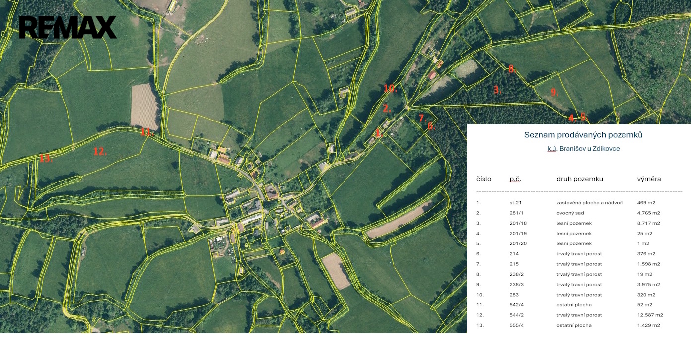 Předmětem prodeje je celkem 34.300 m2 pozemků na nichž se nachází vlastní objekt k bydlení ve funkčním celku se stodolou a navazující zahradou (celkem 5.200 m2), další pozemky - louky (20.300 m2) a lesy (8.800 m2).