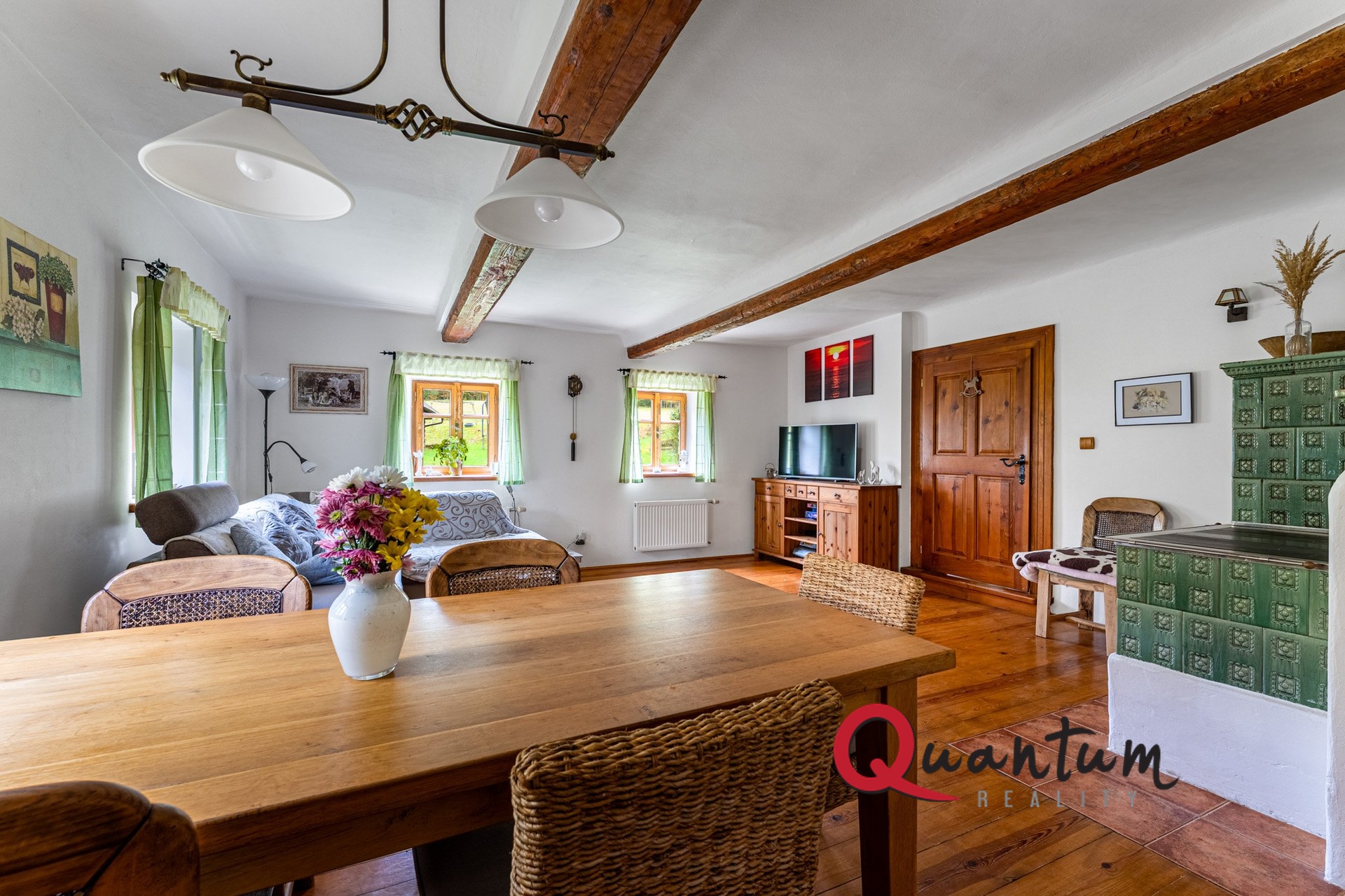 Interiér zachovává původní charakter roubenky – dřevěné trámy, masivní podlahy a kachlová kamna – a zároveň splňuje současné nároky na komfortní bydlení.