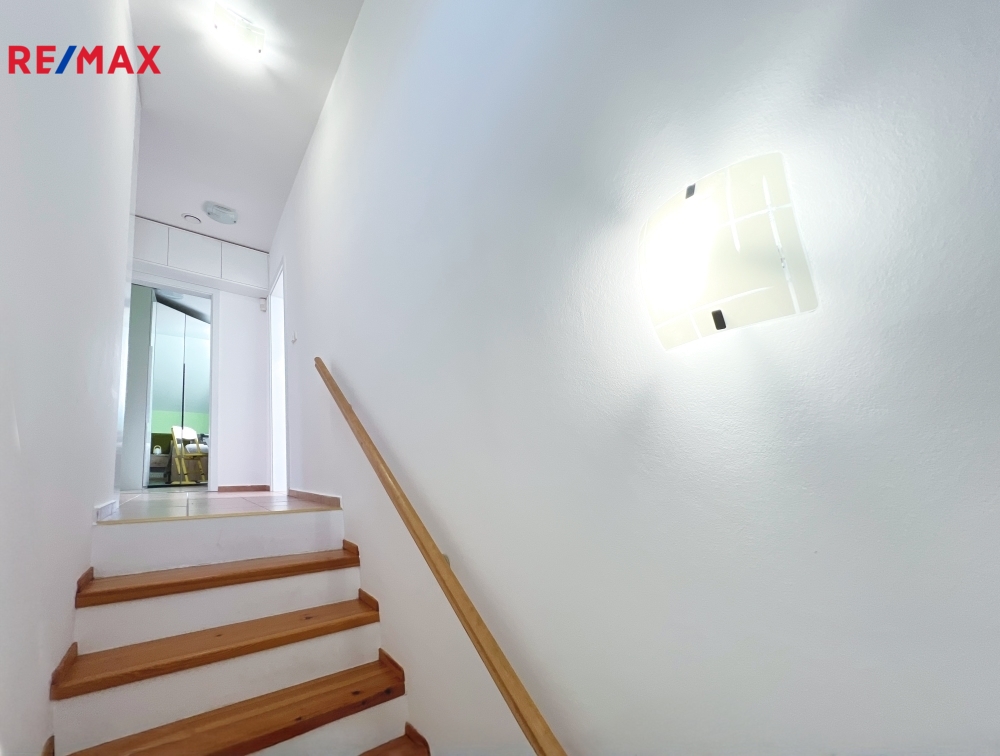 Dům nabízí velkorysý obytný prostor rozložený do dvou podlaží. V přízemí se nachází prostorný obývací pokoj s krbem a přímým vstupem na zahradu a jídelní kout, samostatná kuchyně, pokoj pro hosty a koupelna se sprchovým koutem a WC. Na chodbě je praktický úložný prostor.