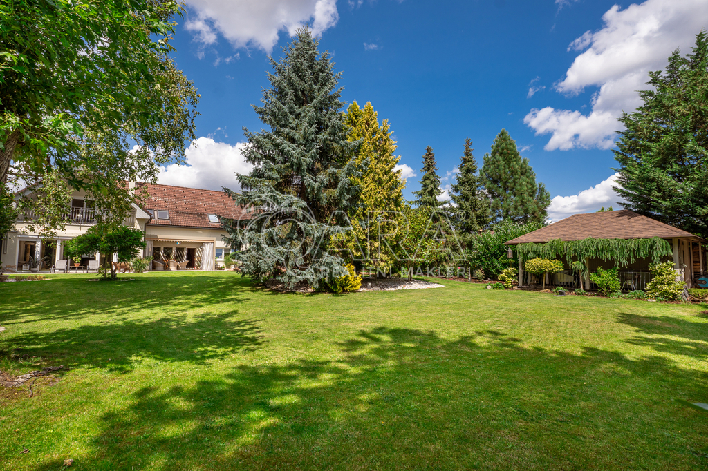 Perfektní stav, promyšlené detaily, soukromá parková zahrada s altánem, dvěma domky, automatickou závlahou, vrtanou studnou a možností parkování až pro osm aut.