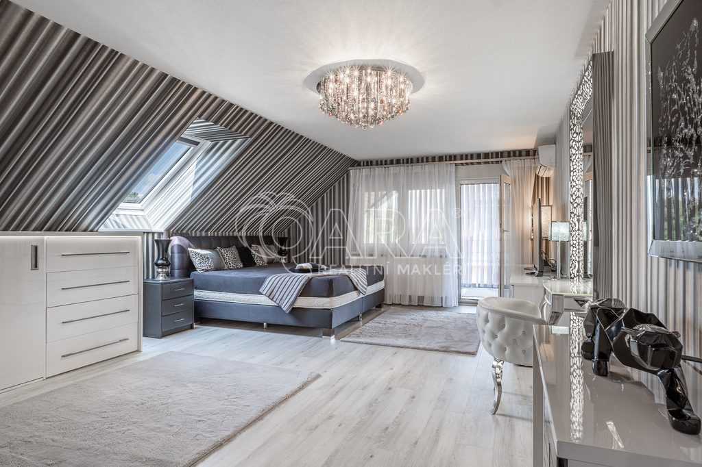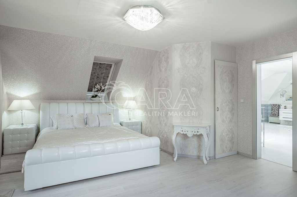 • 2. nadzemní podlaží (212 m²) – 4 ložnice včetně luxusní „černé“ a „bílé“, dvě terasy (jedna zasklená s fitness vybavením), tři šatny, úchvatná horní koupelna 22 m2, kvalitní interiérové dveře Sapeli.