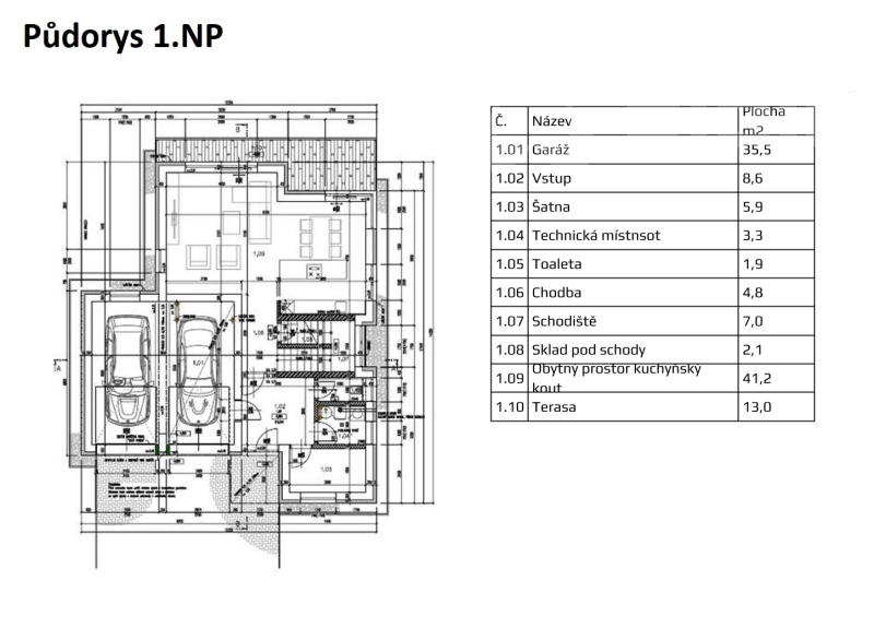 Přízemí tvoří velkorysá dvojgaráž se dvěma samostatnými vraty, technická místnost, vstupní hala, samostatná šatna, samostatné WC, sklad a rozsáhlý obývací prostor s kuchyňským koutem a přímým vstupem na terasu.