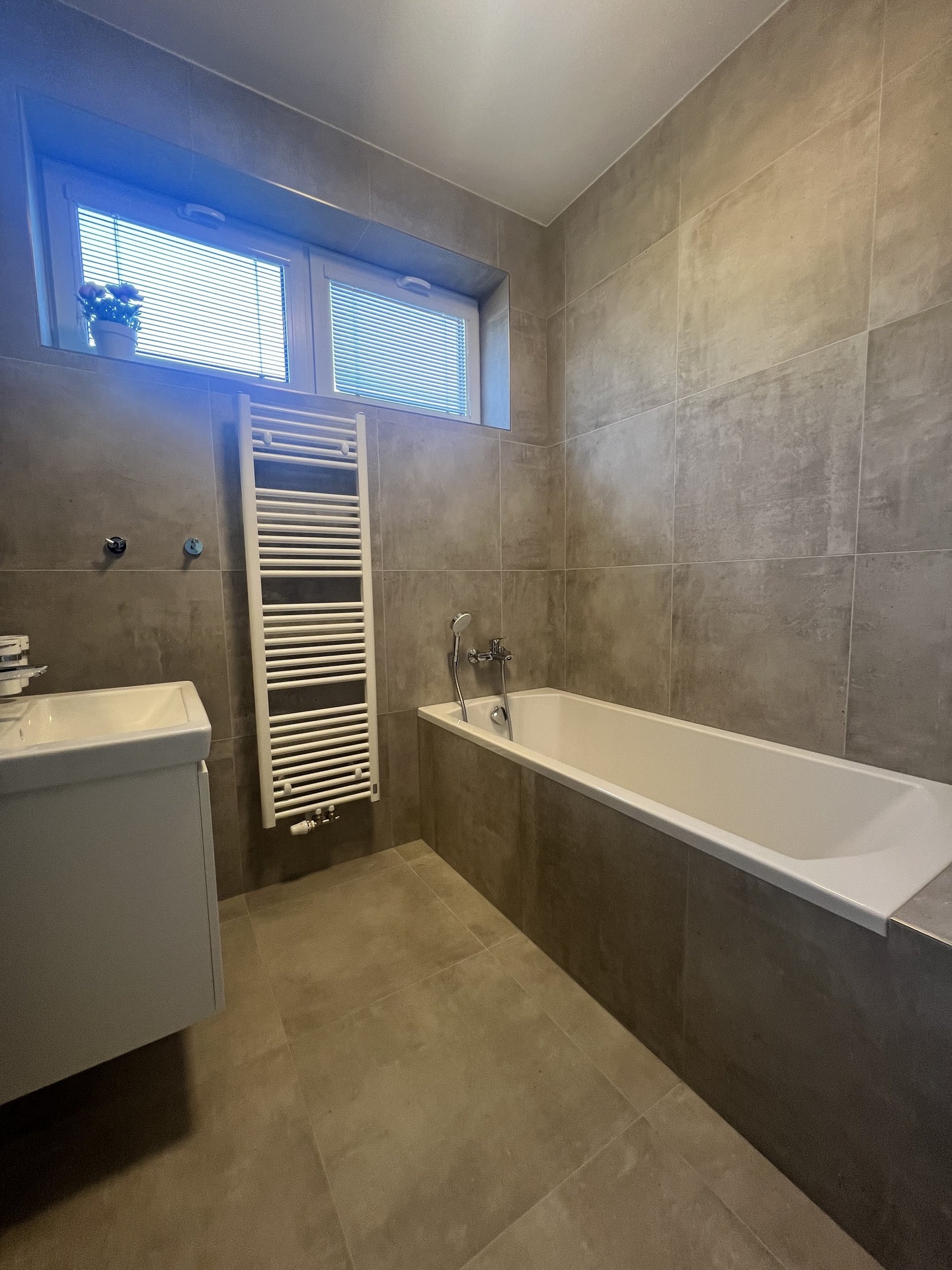 Koupelna je vybavena vanou, umyvadlem, skřínkou pod umyvadlem a otopným žebříkem.