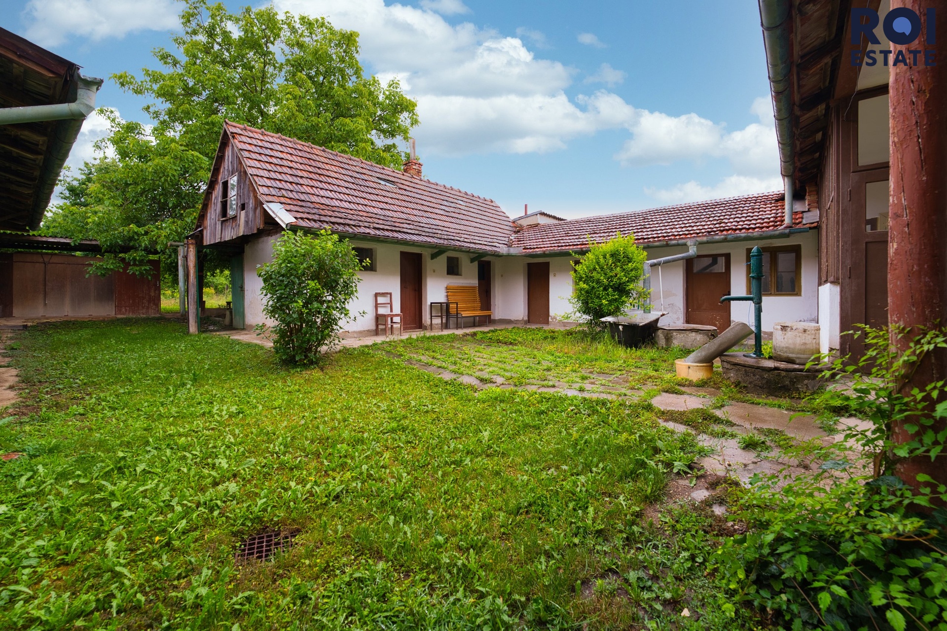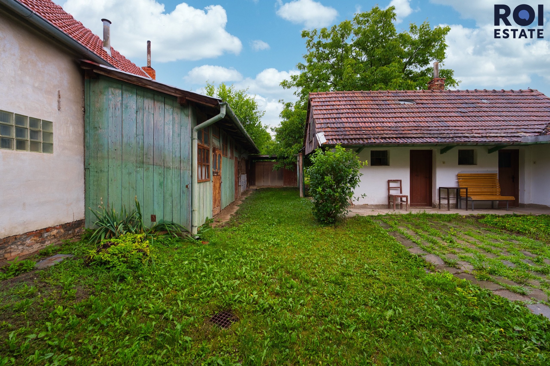 Z interiéru se vchází na zasklenou verandu, ideální třeba pro ranní kávu. Odtud je přístupná i komora, kterou můžete využít jako praktickou spíž. Následuje dvůr, kde se nachází několik dalších místností v původním stavu – přímo vybízejí k tomu, aby se z nich stala letní kuchyně, dílna, prádelna nebo prostor pro tvoření. Dům je částečně posklepený.