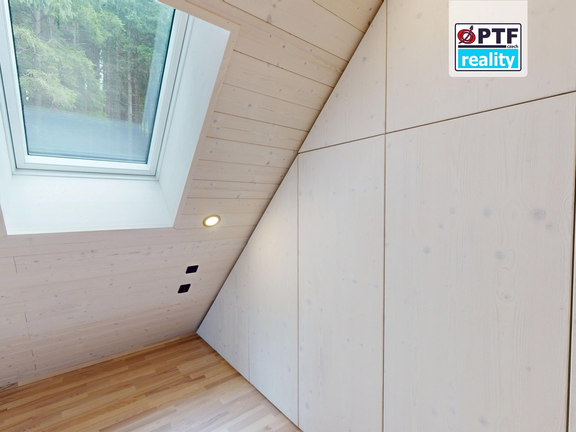 Podkroví: Útulná ložnice s dostatkem úložného prostoru díky vestavěným skříním na míru, a galerie, která skvěle poslouží jako dětský pokoj nebo klidová/pracovní zóna.