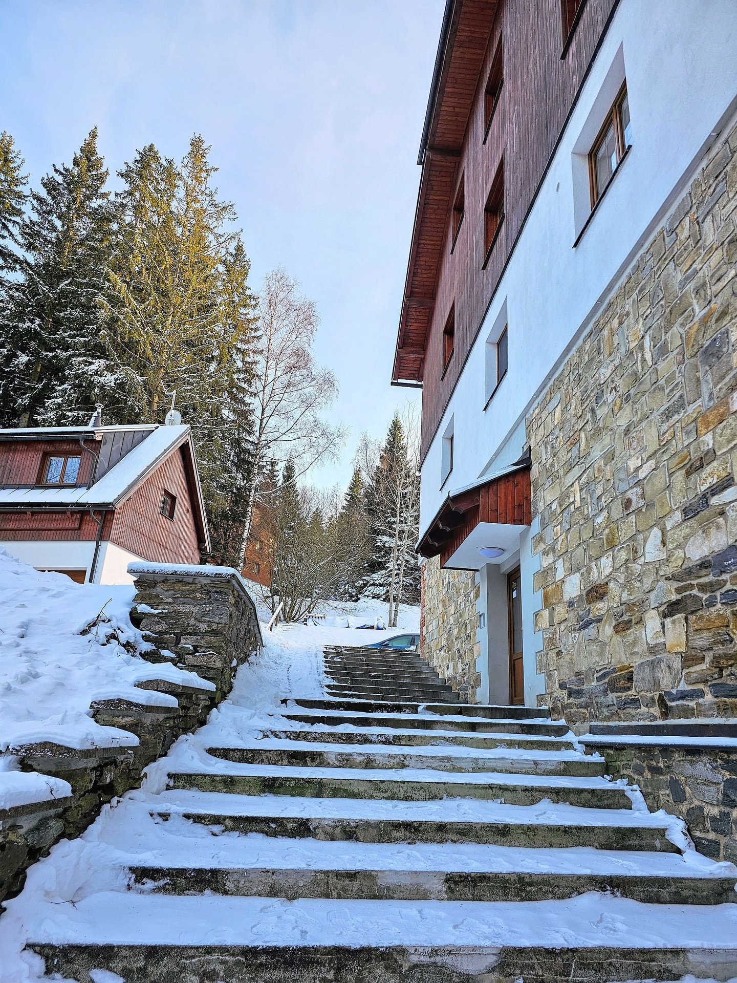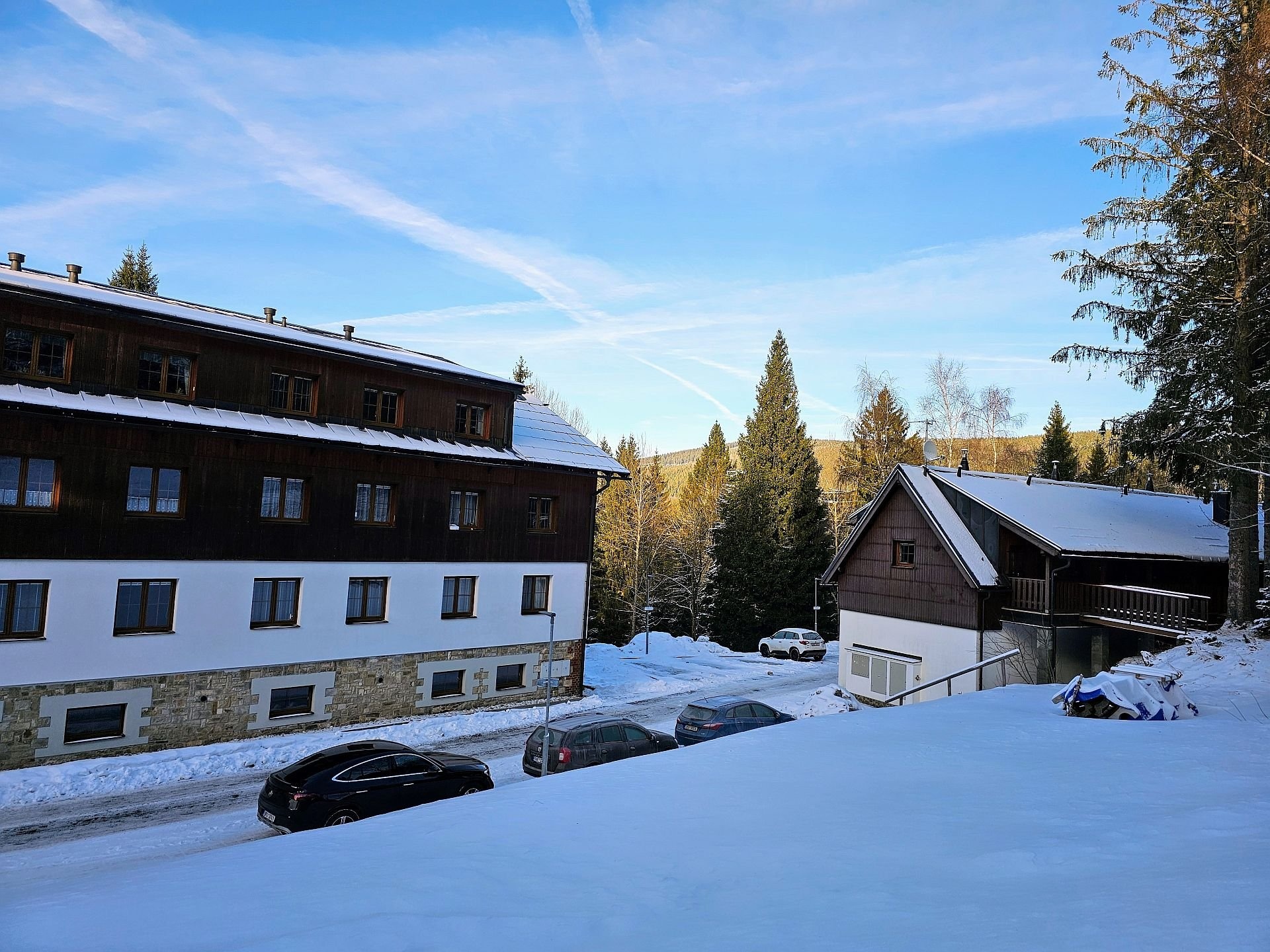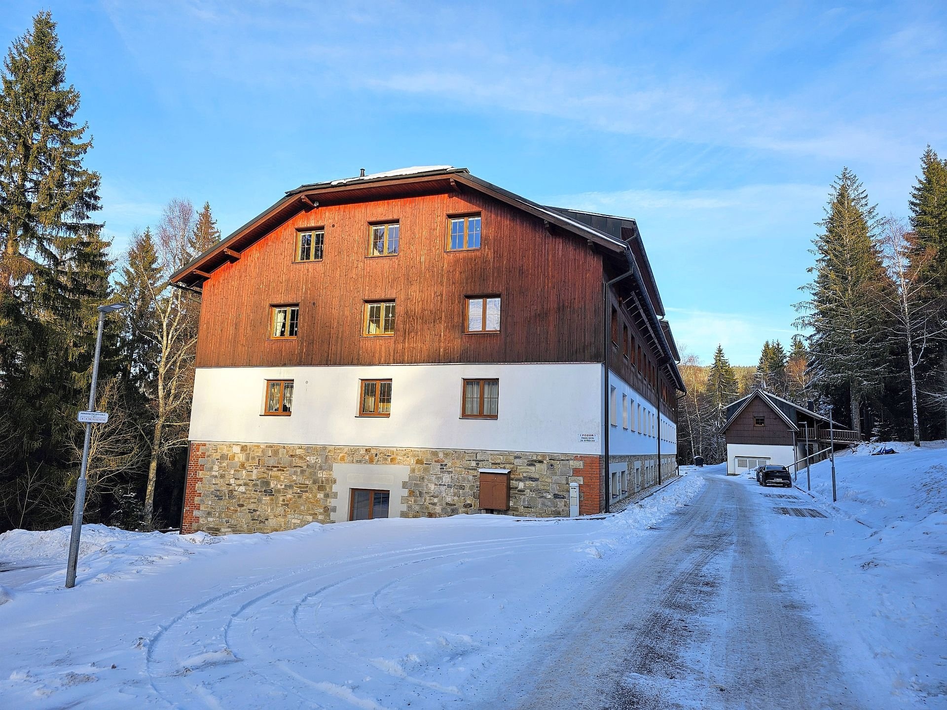 Byt se nachází ve druhém nadzemním podlaží typického horského domu na klidném místě zvané Sruby nedaleko Špičáckého sedla. Byt je dispozičně rozdělen na obývací místnost s kuchyňským koutem, ložnici a sociální zařízení. Předností je klidné místo s dobrým přístupem po asfaltové komunikaci, v bytě pak velká šatna ve vstupní předsíni, výtah v domě a prostorný zděny sklep v přízemí domu. Parkování je možné přímo před domem v uzavřeném areálu za vjezdovou závorou.