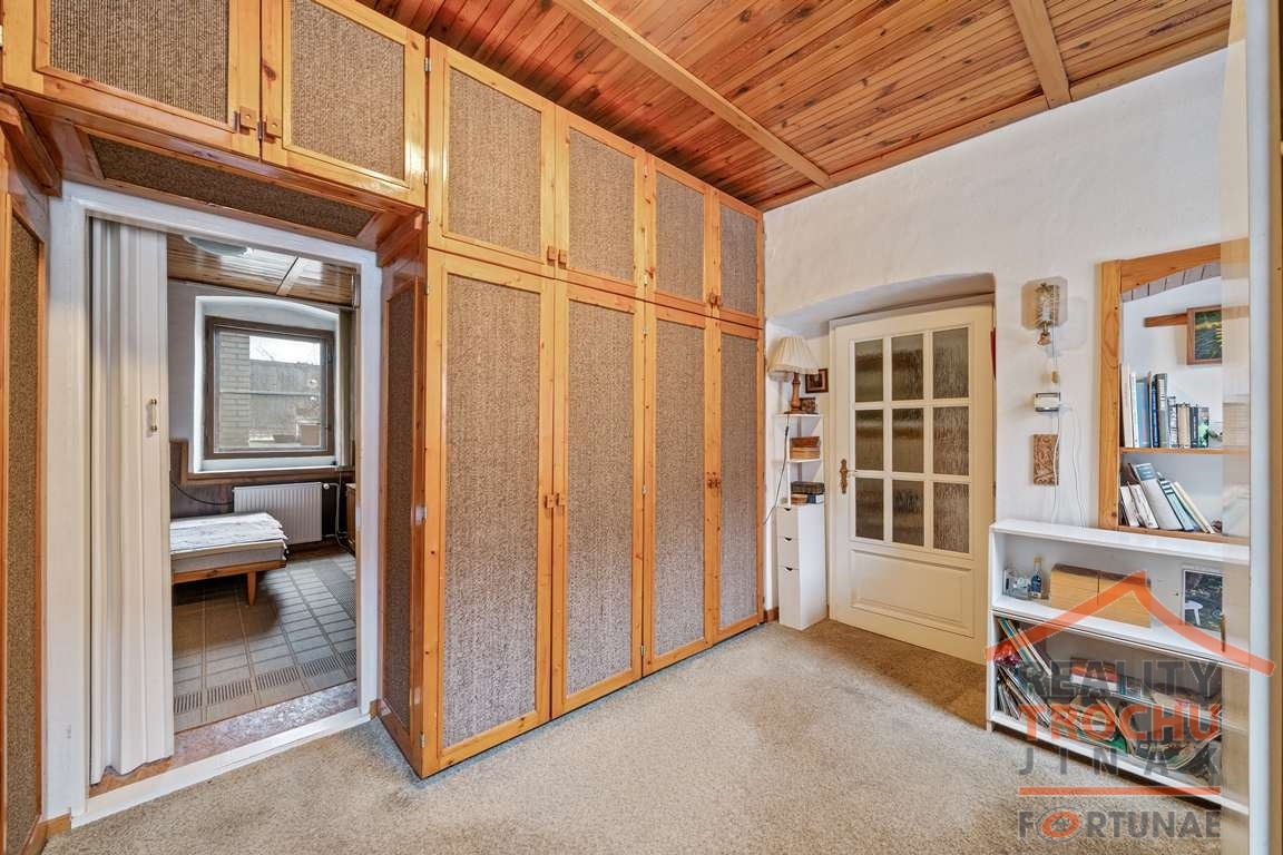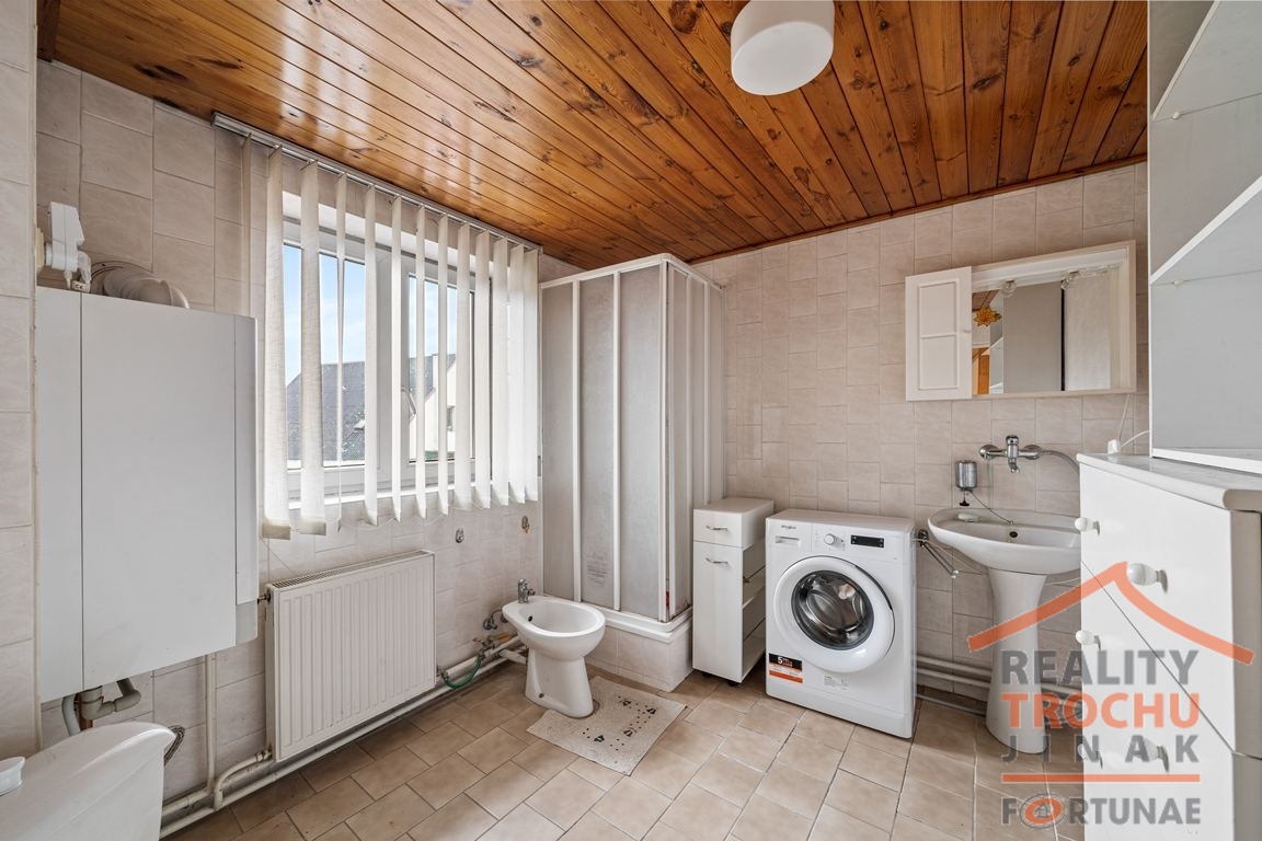 Podkroví: obytná hala, ložnice, koupelna (sprchový kout, WC, bidet), zasklen. lodžie. Celkem plocha 77 m².