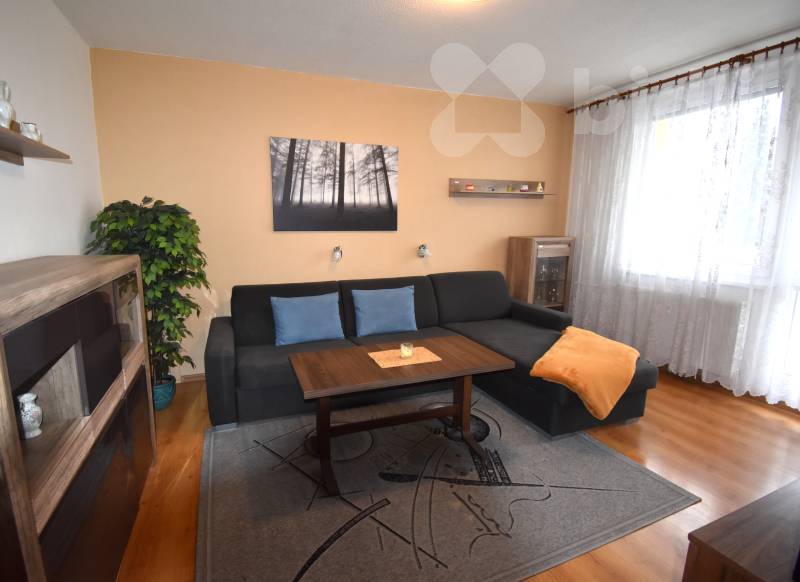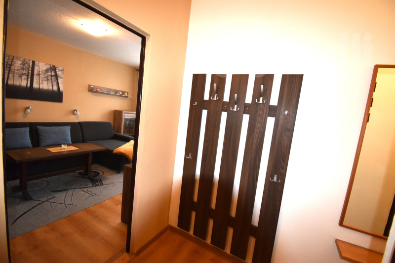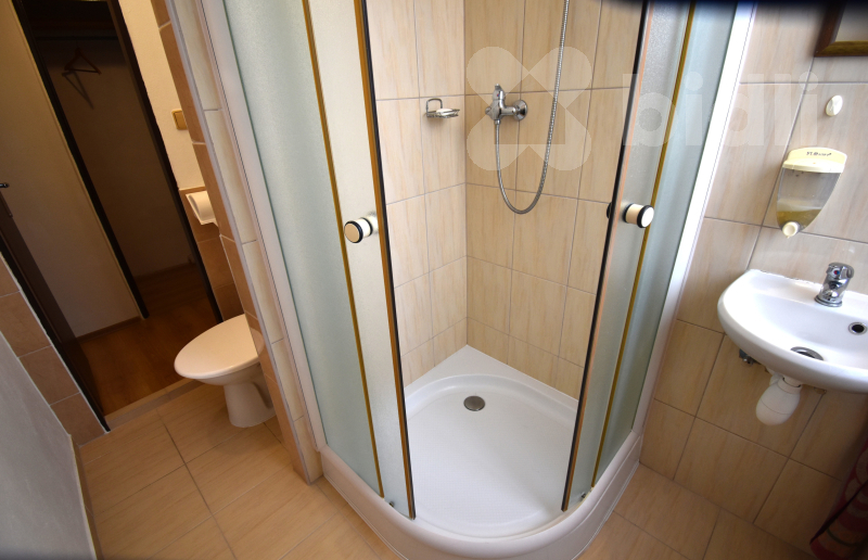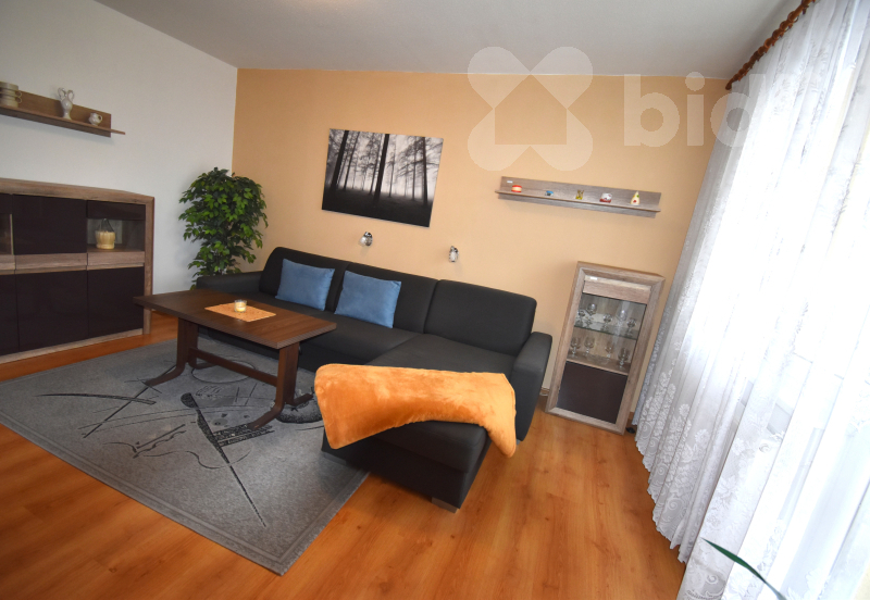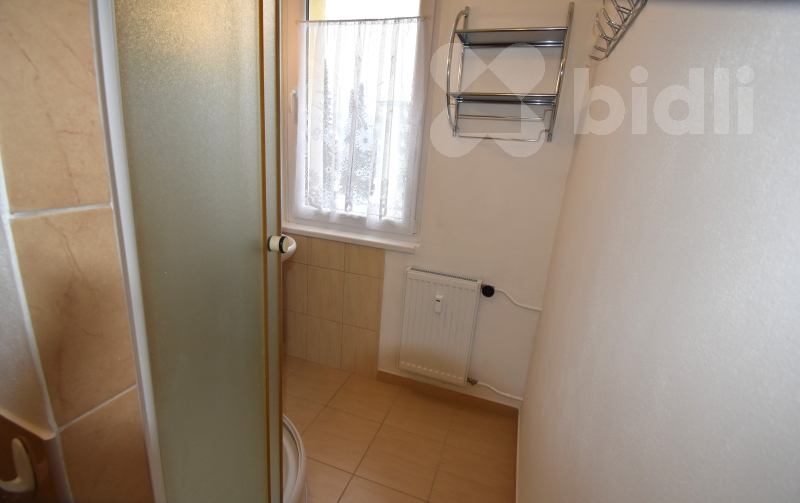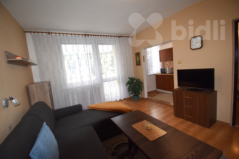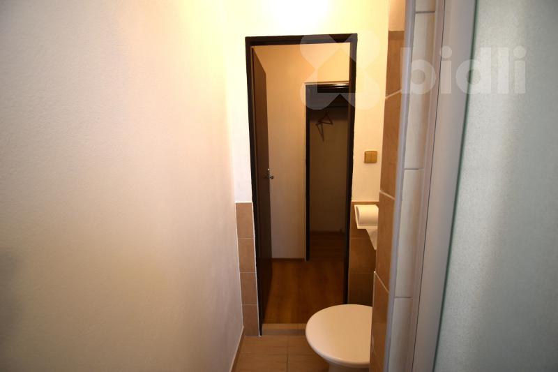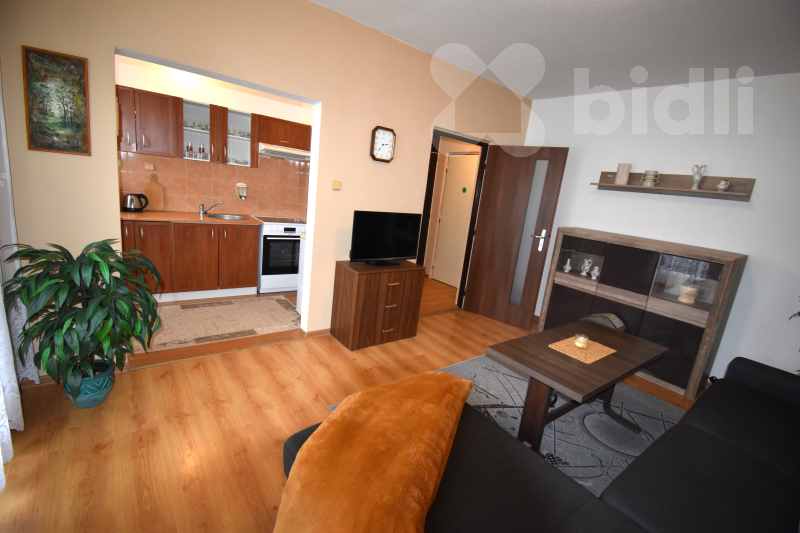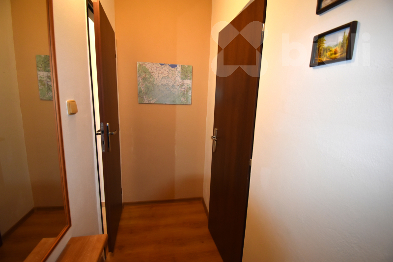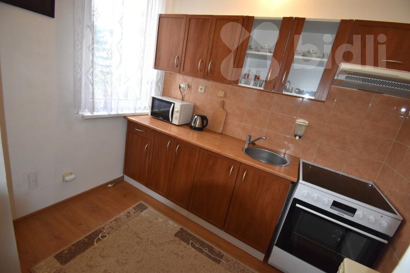 Nabízíme k pronájmu zařízený byt nacházející se ve 2. nadzemním podlaží (bez výtahu). Byt disponuje balkónem a náleží k němu také prostorný sklep. Dispozice bytu zahrnuje předsíň s vestavnou skříní a samostatnou komoru sloužící jako šatna. Kuchyně je vybavena spotřebiči, včetně lednice (vejde se i větší lednice namísto současné malé). V kuchyni je rovněž přípojka na pračku. Koupelna je vybavena sprchovým koutem, umyvadlem, WC a má okno.