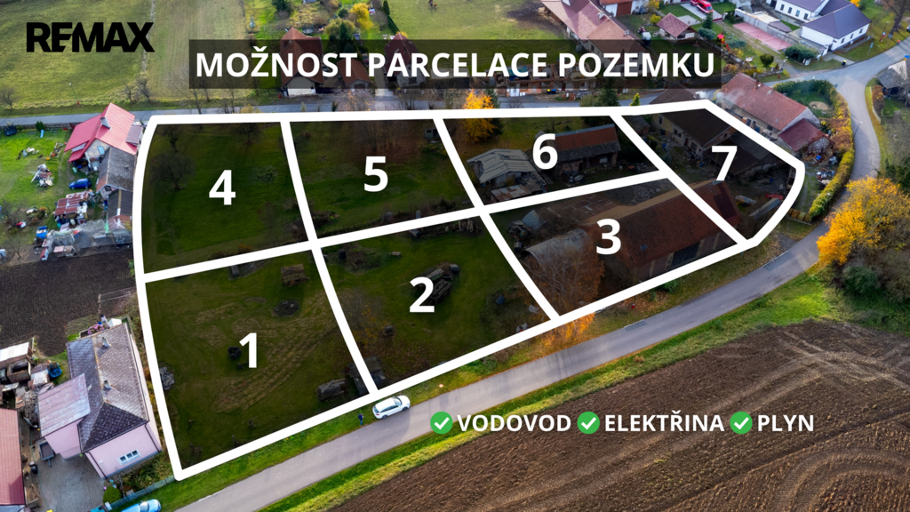 Pozemek je kompletně vedený jako stavební, má rozlohu 7 032 m² a nabízí skvělý investiční potenciál. V současnosti je využíván pro zemědělské účely, je však možné jej také rozdělit na několik samostatných stavebních parcel a ty následně prodat, nebo zhodnotit výstavbou rodinných domů, či jiným investičním záměrem.