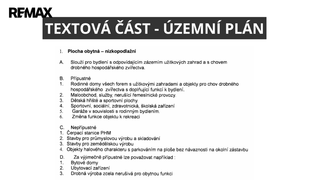 Kompletní informace o využitelnosti území naleznete v textové části územního plánu, který je součástí této inzerce.