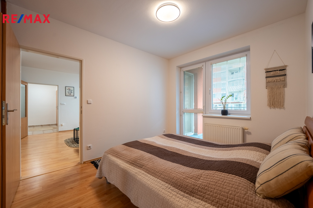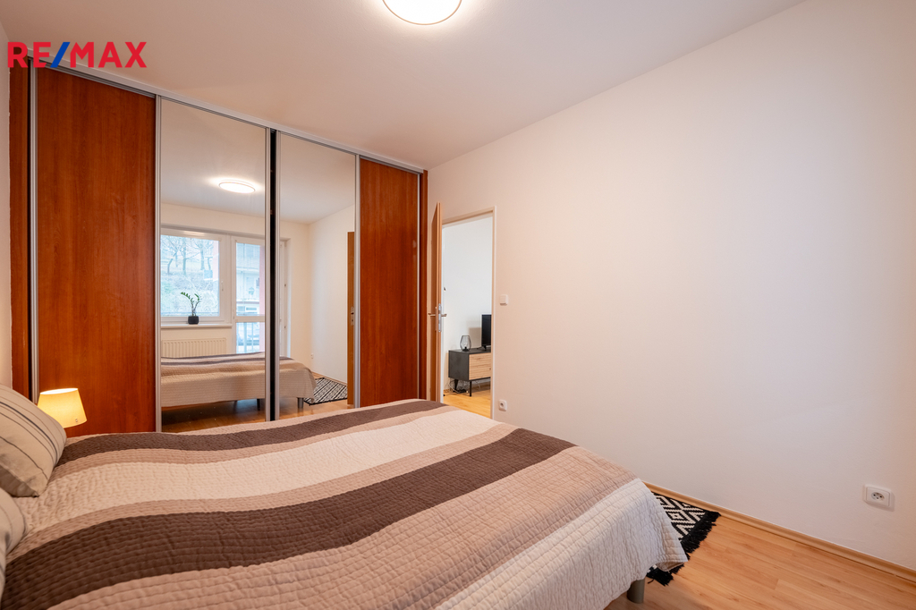 Ložnice nabízí dostatek úložného prostoru díky velké vestavěné skříni a je zde manželská postel. I z ložnice je přímý vstup na balkon, což ještě umocňuje pocit klidného a komfortního bydlení.