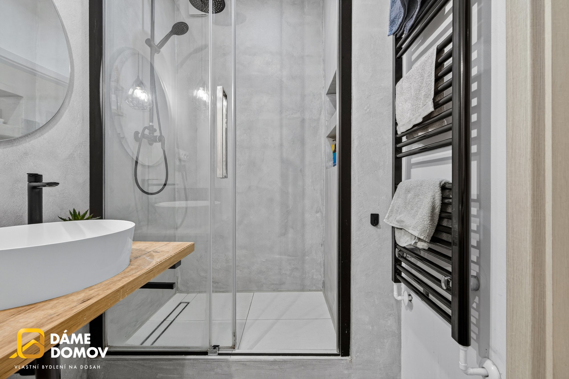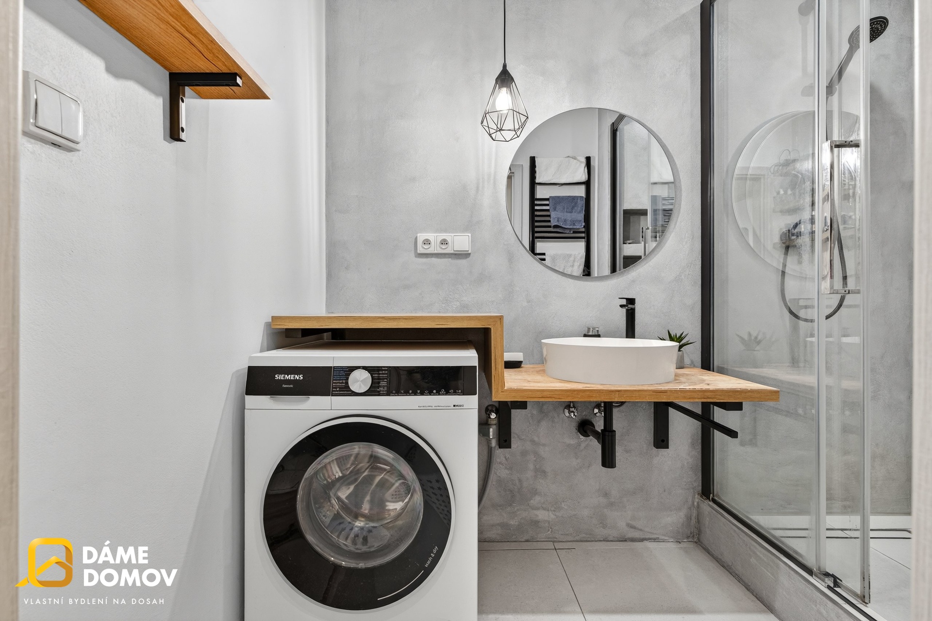 Koupelna je vybavena sprchovým koutem a kombinovanou pračkou se sušičkou. Příjemným bonusem je balkon s výhledem do okolí, který poskytuje ideální místo k relaxaci.