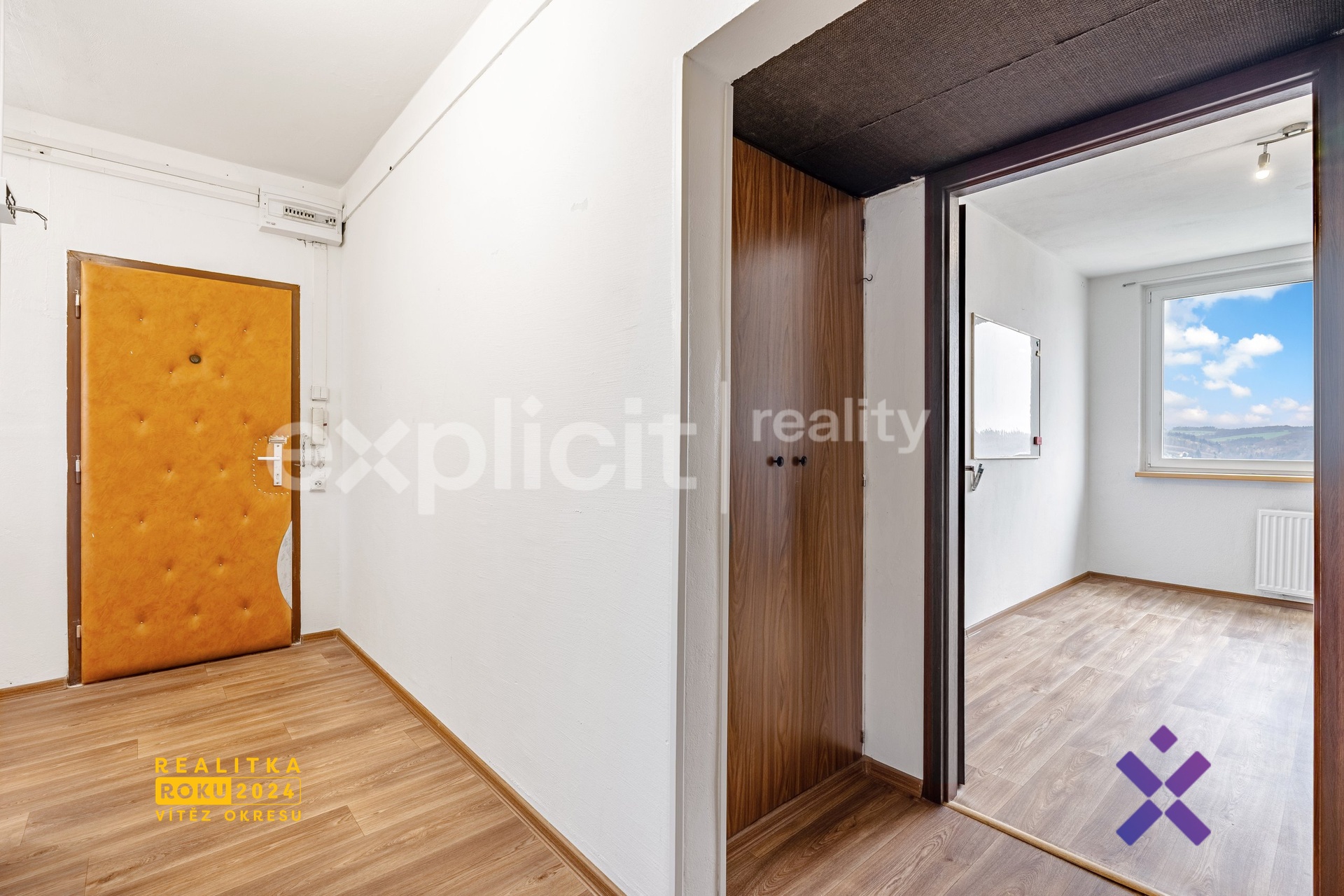 Prakticky řešené zádveří nabízí dostatek místa pro uložení kabátů i obuvi. Z chodby se dostanete do prvního pokoje, který je díky své poloze a variabilitě ideální jako pracovna nebo dětský pokoj. V této části chodby se nacházejí také dvě praktické komory, které poskytují další úložný prostor.