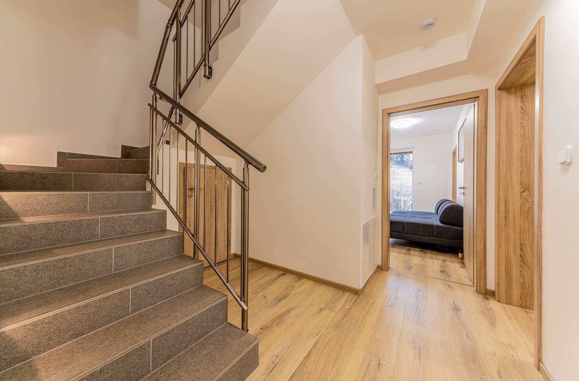 Nepostradatelným prvkem interiéru je elegantní schodiště procházející celým domem s leštěným zábradlím a decentním osvětlením, které umocňuje pocit vzdušnosti a moderního designu. Promyšlená dispozice domu zajišťuje dostatek přirozeného světla v celém interiéru, zatímco světlík ve 2. NP krásně prosvětluje chodbu i schodišťový prostor a podtrhuje vzdušnost domu.