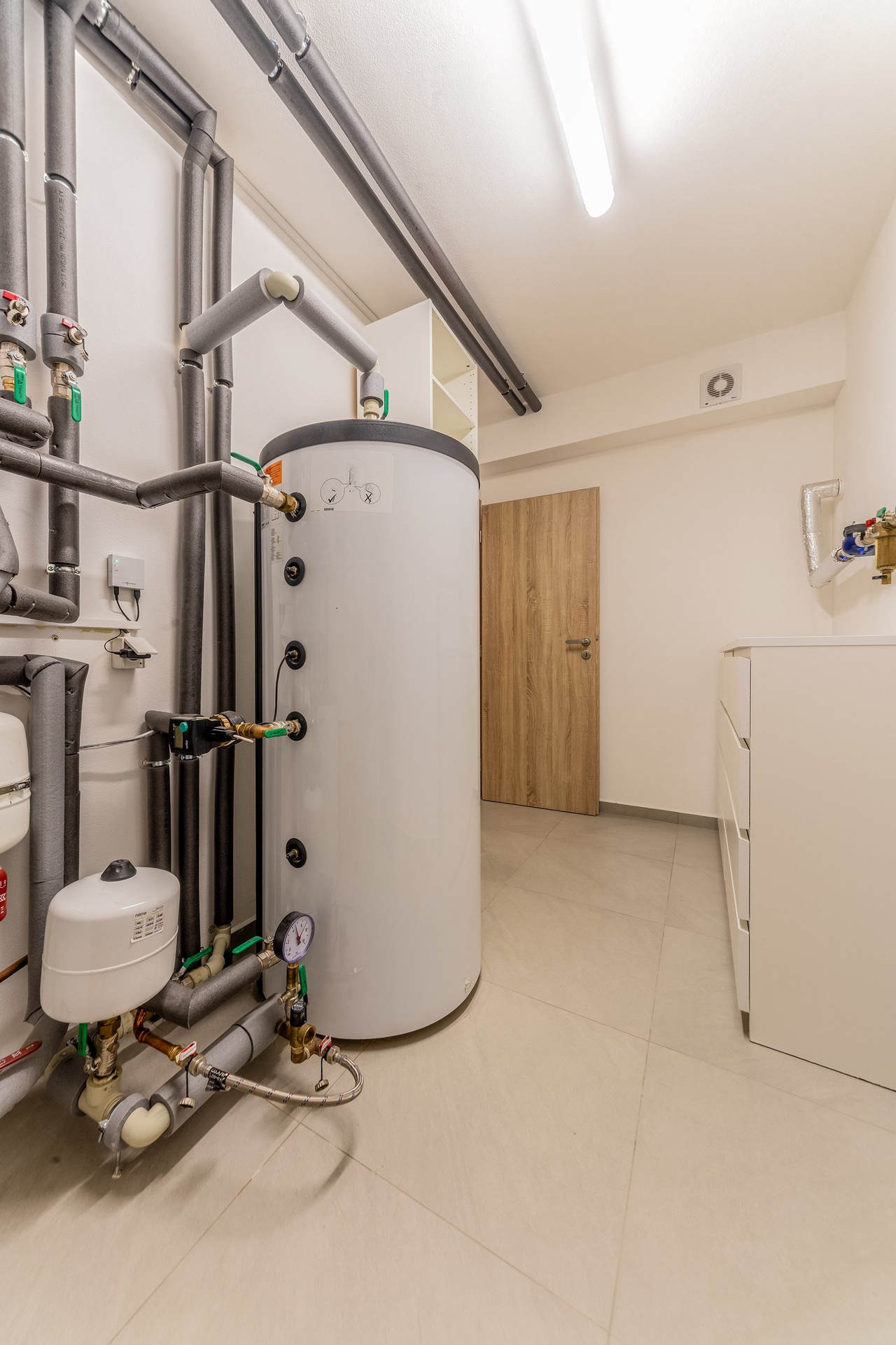 Dům je vybaven podlahovým vytápěním, plastovými okny s izolačním trojsklem v elegantním antracitovém odstínu, vnitřními žaluziemi na všech oknech i dveřích, sítěmi proti hmyzu, detektory proti kouři, bezpečnostním a kamerovým systémem se záznamem. Interiér domu disponuje vinylovými podlahami v obytných místnostech a keramickou dlažbou v obou koupelnách, WC, technické místnosti, komoře, lodžii, na terase a schodišti. V domě jsou provedeny datové a televizní rozvody (TV anténa, kabelová TV, internet). O vytápění se stará tepelné čerpadlo (vzduch-voda) s akumulačním zásobníkem a ohřev TUV zajišťuje elektrický kondenzační kotel s akumulačním zásobníkem s úsporným provozem. Teplota je regulována samostatnými termostaty v hlavních místnostech, tedy v obývacích pokojích a koupelnách, což přispívá k efektivnímu hospodaření s energií. V garáži je pak k dispozici elektrická přípojka 400 V a přívod studené vody.