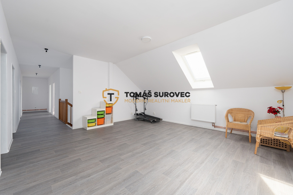 V přízemí se nachází velký obývací pokoj s kuchyní o rozloze 48 m², ložnice, další pokoj, koupelna, samostatné WC a technická místnost. V patře jsou tři neprůchozí pokoje, pracovna a prostorná hala, která může sloužit jako herna, studovna nebo odpočinková zóna. V přízemí je podlahové vytápění, v patře radiátory. Celková obytná plocha činí 235 m².