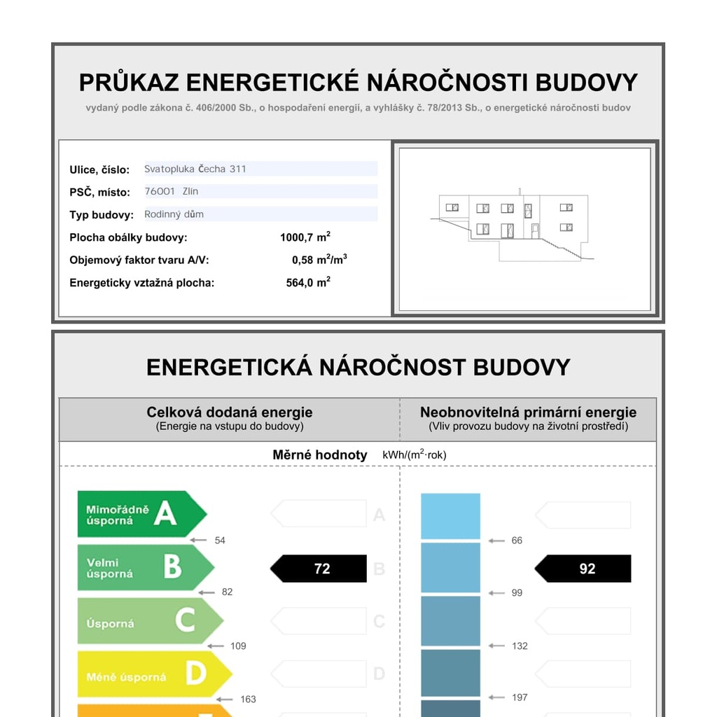 - Ukazatel energetické náročnosti budovy: 72 kWh/m²